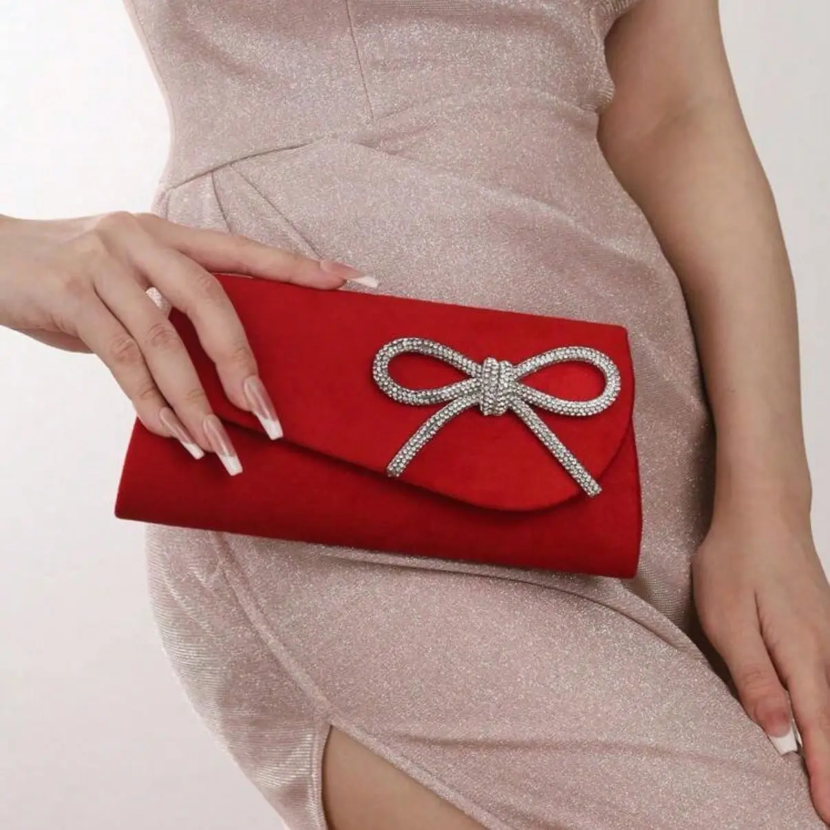 Red Mini Handbag Clutch Sparkly Rhinestone Bow Decor Purse Women Evening Bag Crossbodybag Shoulderbag With Chain For Party & Wedding, Perfect Valentine's Day Gift