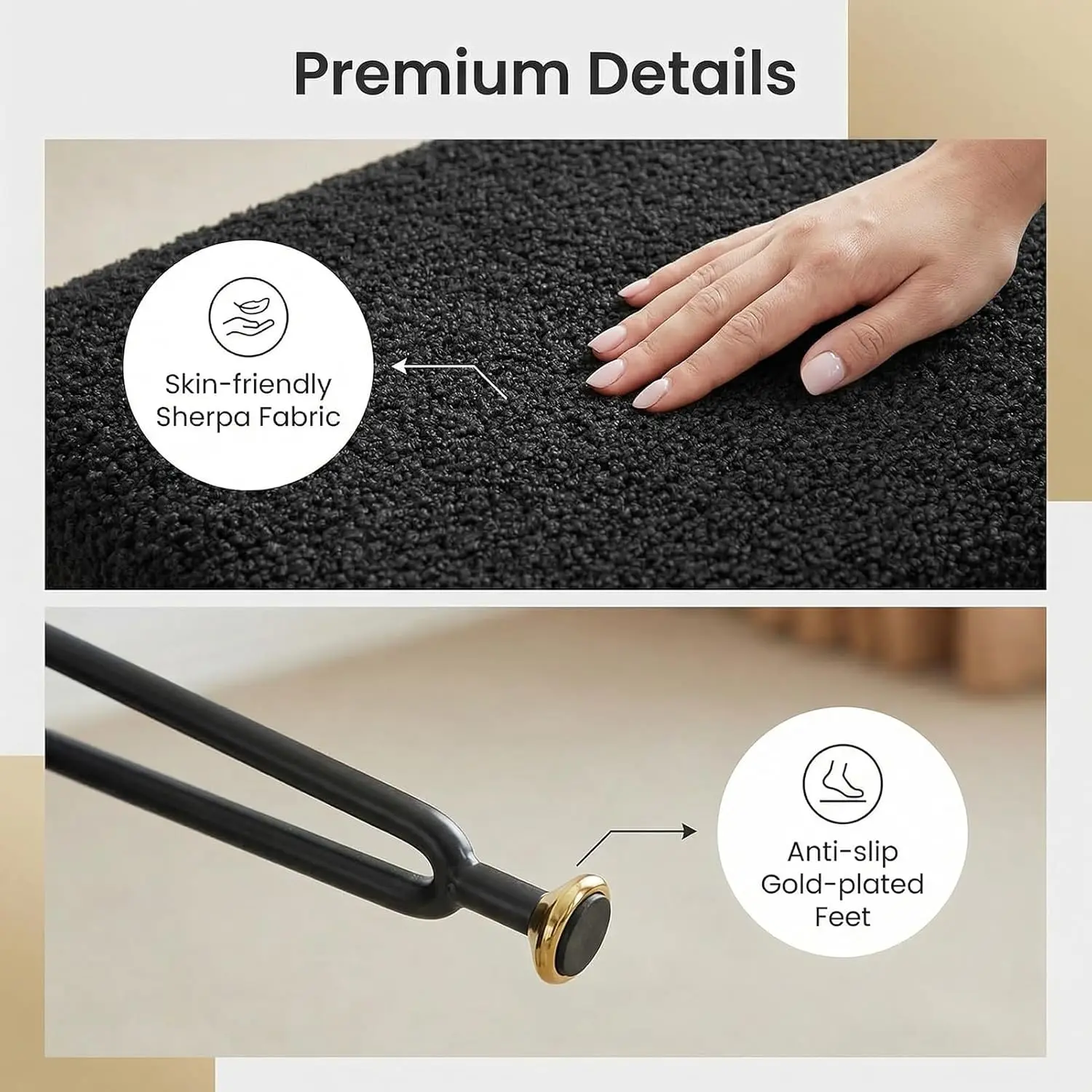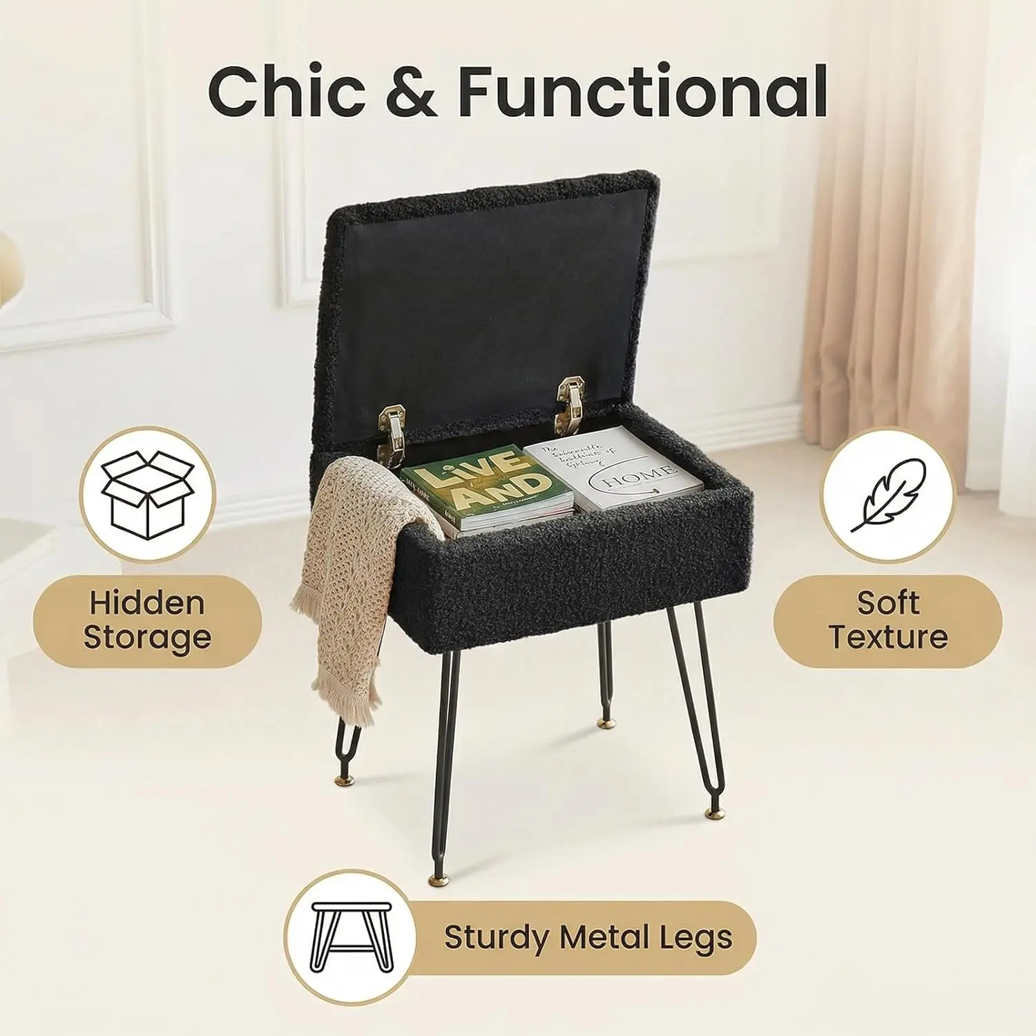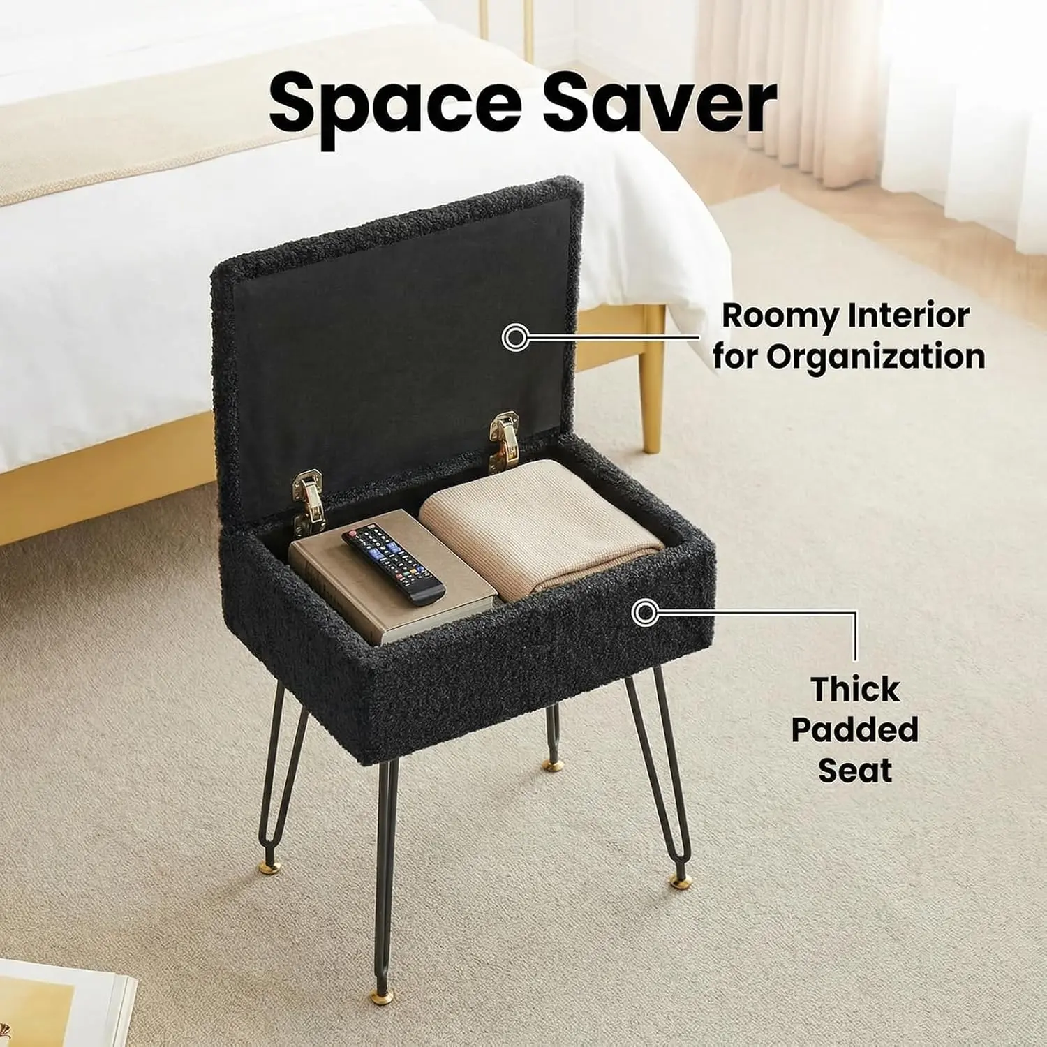 Dressing table stool, faux teddy velvet footstool, equipped with metal legs and adjustable black foot pads, flip-top storage makeup stool with cushioned seat, suitable for dressing rooms and bedrooms, black