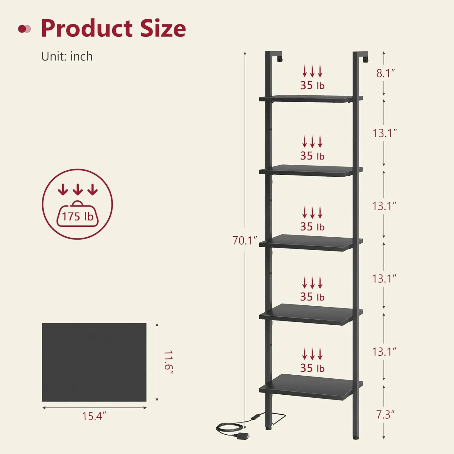 5-tier lighted ladder bookshelf, wooden wall-mounted bookshelf, metal frame ladder bookshelf, suitable for office, living room, bedroom, black