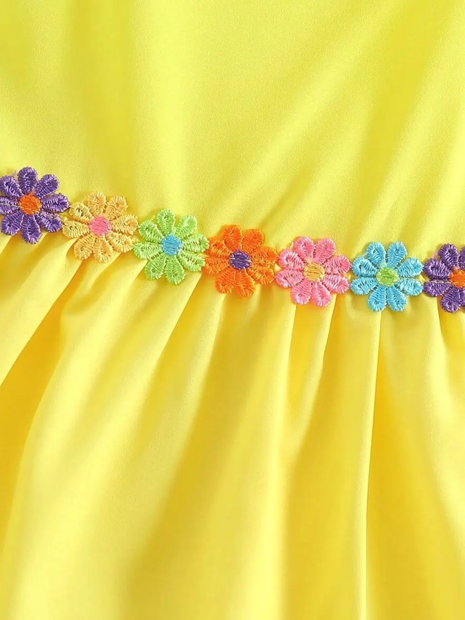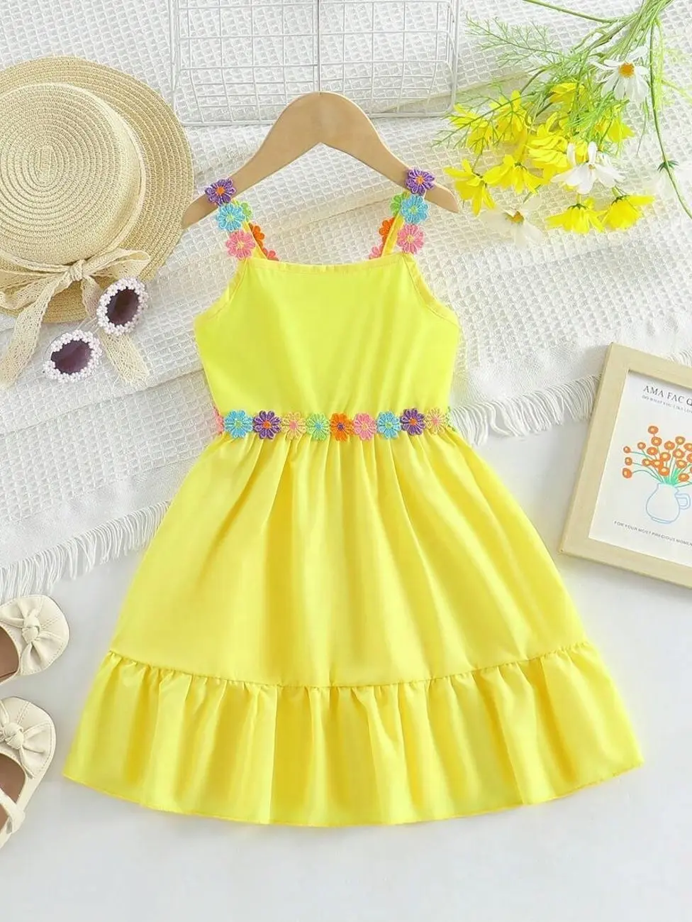 2025 Hot Selling Girls Dress, New Summer Cute Sweet Floral Embroidered Decor Yellow Sleeveless Strap Dress