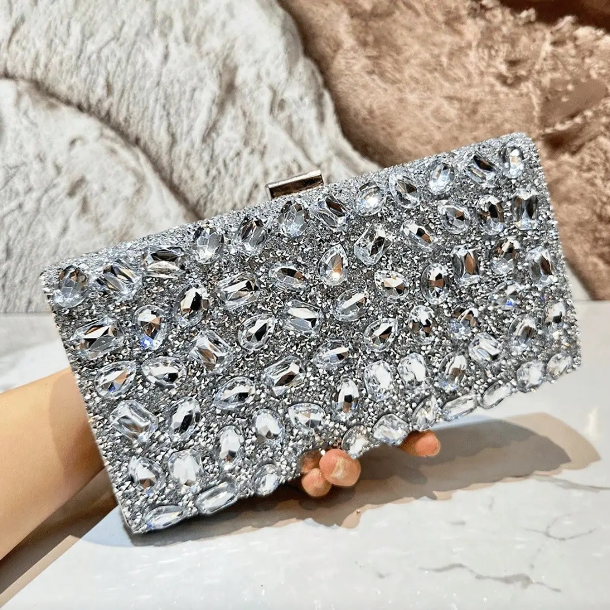 Silver Rhinestone-Embellished Evening Clutch with Detachable Chain a Versatile Shoulder, Crossbody, or Party Wallet. This fully rhinestone-covered mini bag is perfect for parties, weddings, Christmas celebrations, and similar occasions.