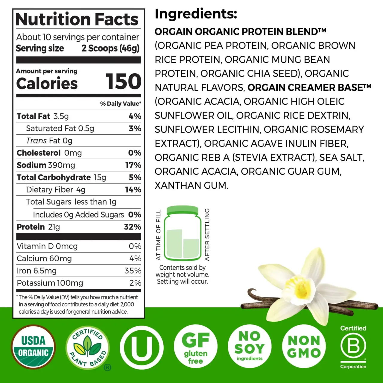 Orgain Organic Protein Blend (Organic Pea Protein,Organic Brown Rice Protein,Organic Mung Bean Protein,Organic Chia Seed),Organic Natural Flavors,Orgain Creamer Base (Organic Acacia,Organic High Oleic Sunflower Oil,Organic Rice Dextrin,Sunflower Lecithin,Organic Rosemary Extract),Organic Agave Inulin Fiber,Organic Reb A (Stevia Extract),Sea Salt,Organic Acacia,Organic Guar Gum,Xanthan Gum