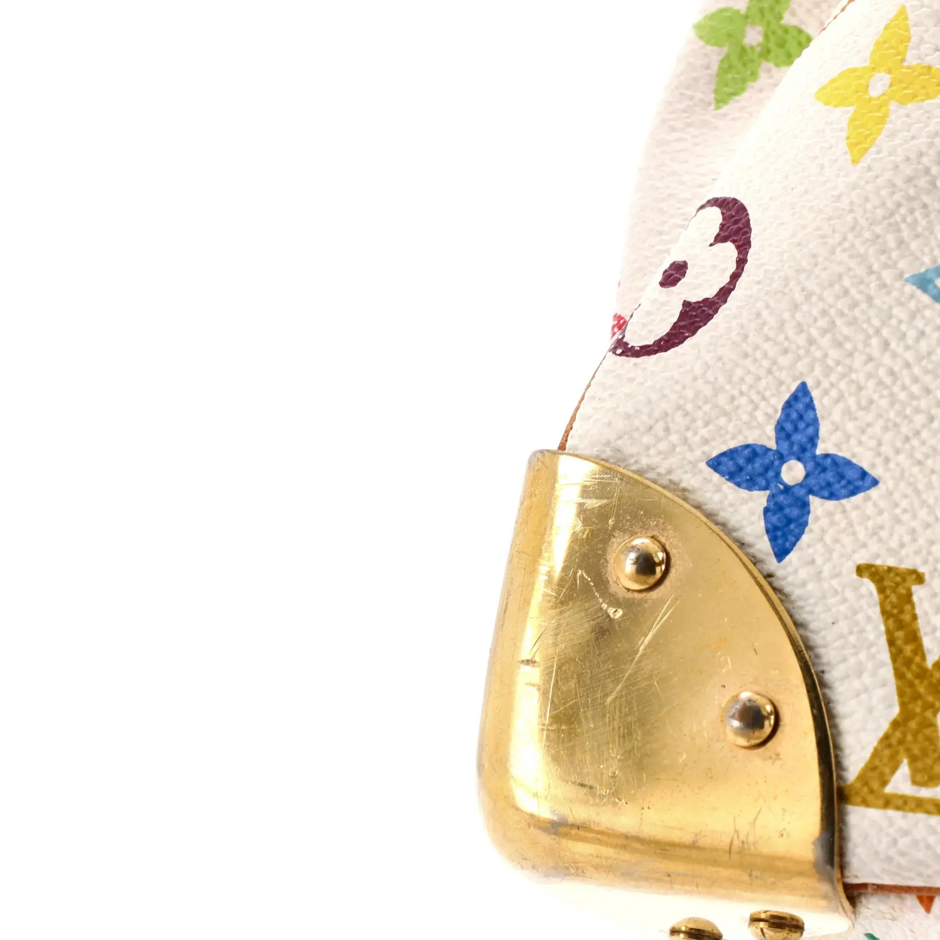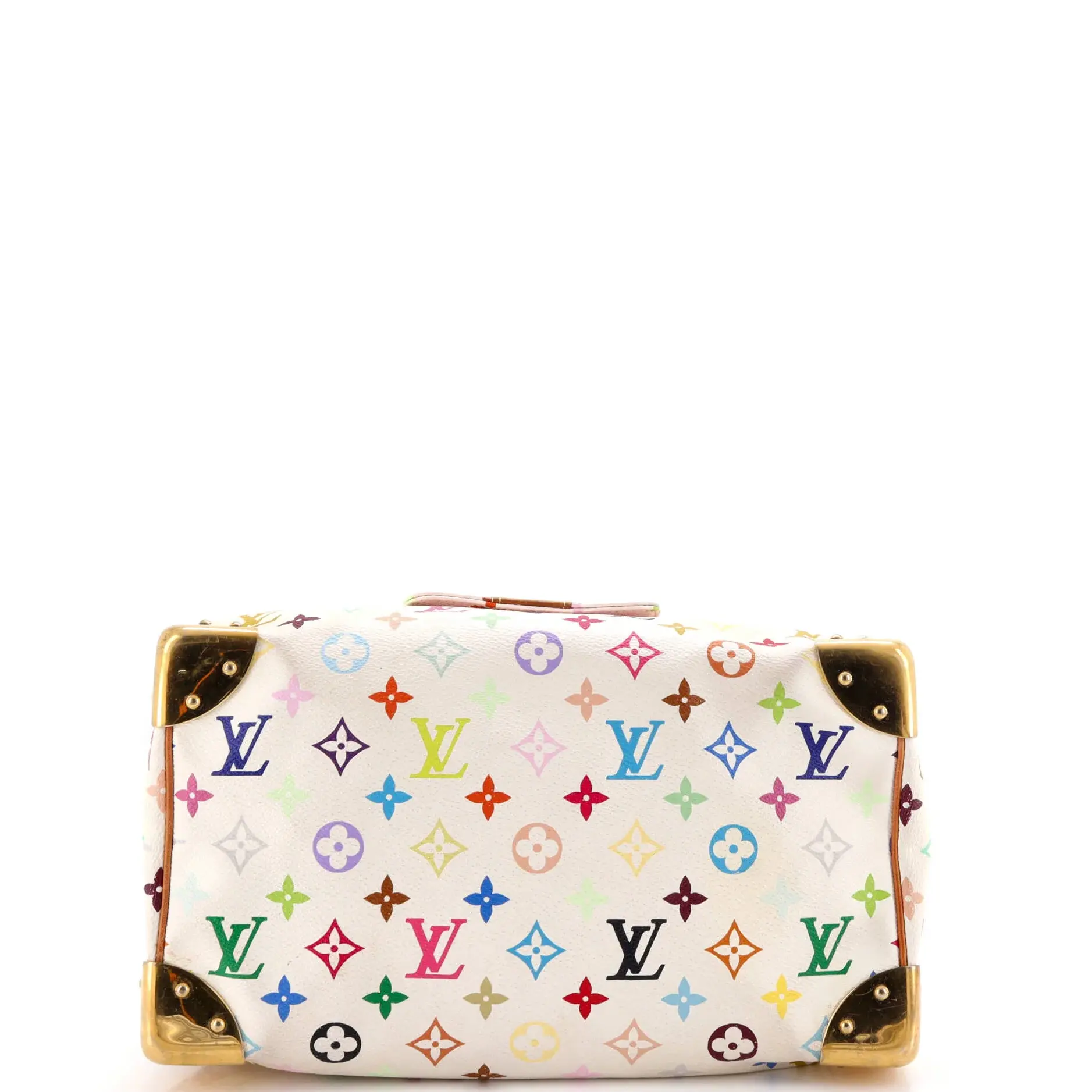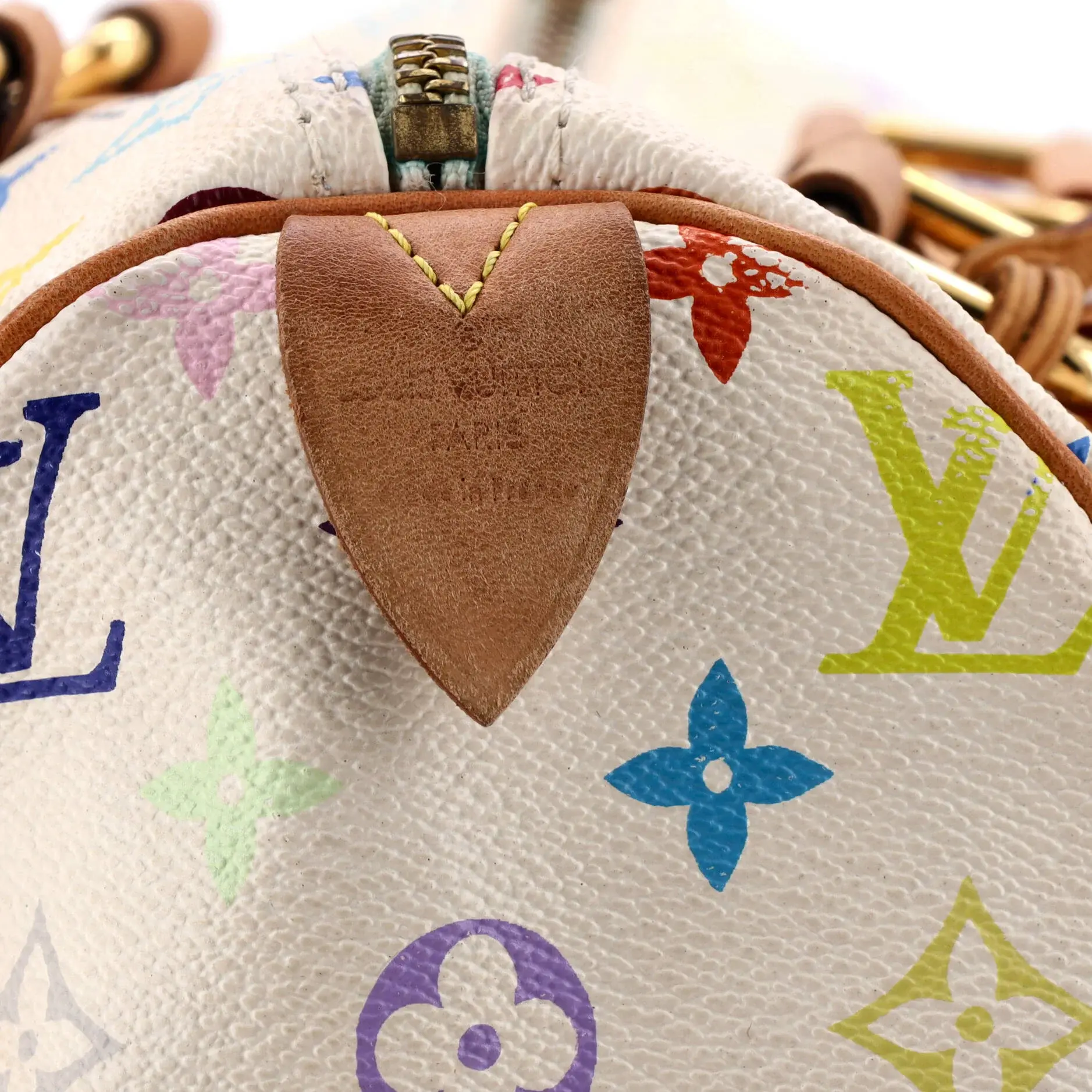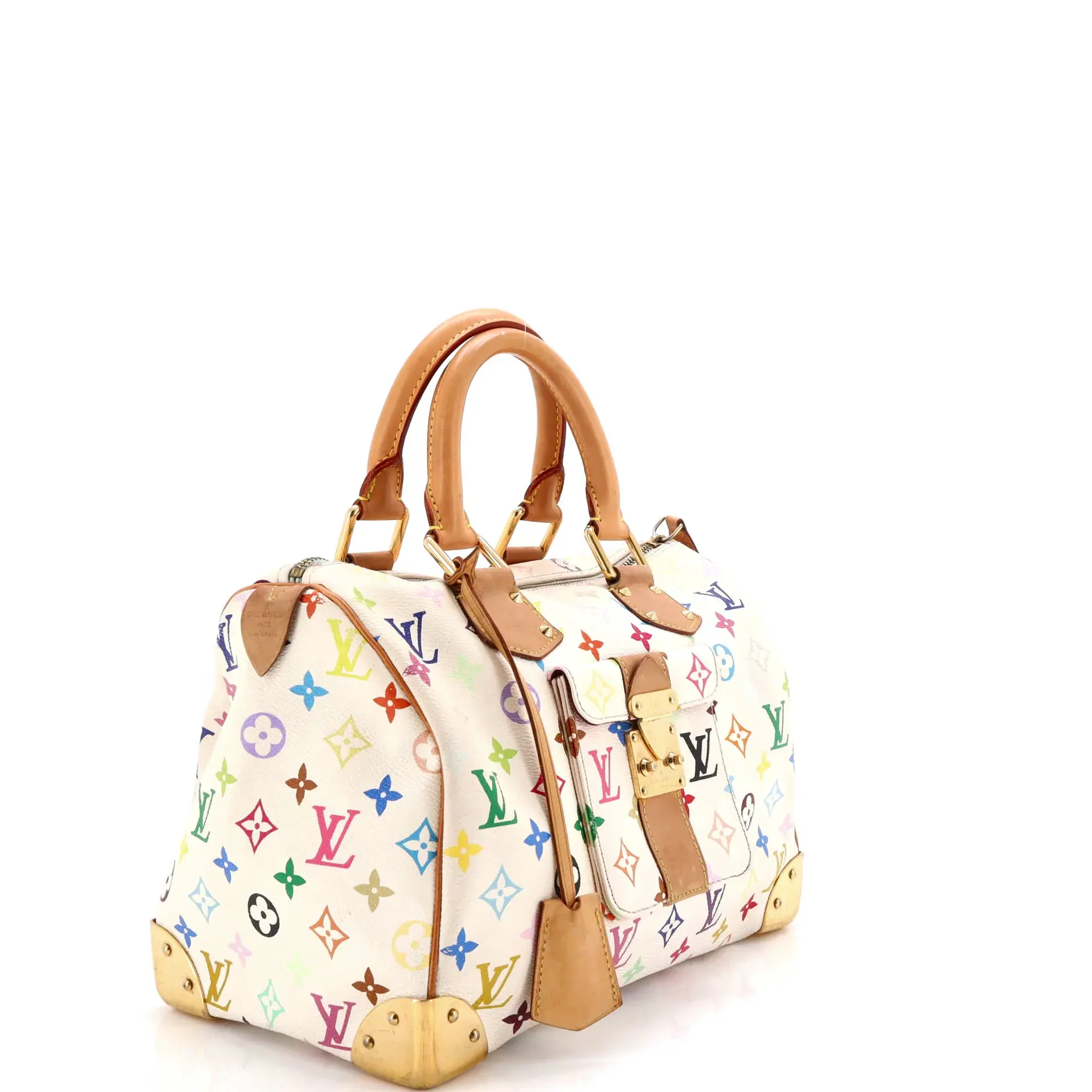 These are professional pictures of the actual item offered by Rebag. Estimated Retail Price: $3,150 Condition: Fair. Exterior: heavy discoloration throughout, scuffs, creases, edge wear | Handles/Straps: cracking, scuffs, discoloration, minor creases | Interior: moderate odor, discoloration, scuffs | Hardware: heavy scratches, tarnished Accessories: Keys, Clochette Measurements: Handle Drop 3.5", Height 8", Width 12", Depth 7", Strap Drop 19.5-23" Designer: Louis Vuitton Model: Speedy Handbag Monogram Multicolor 30 Exterior Material: Canvas Coated Exterior Color: Multicolor, White Interior Material: Microfiber Interior Color: Red Hardware Color: Gold Brand Code: SP0055 Item Number: 383648/1