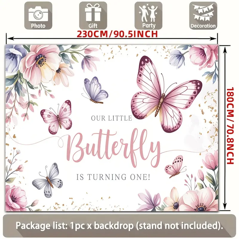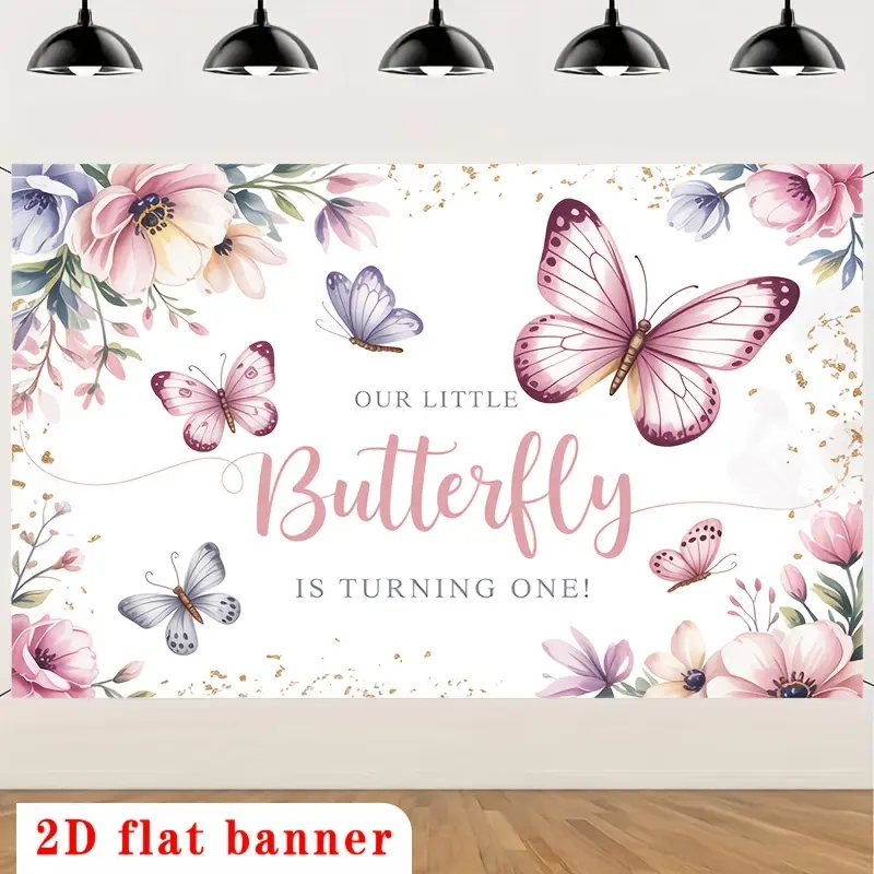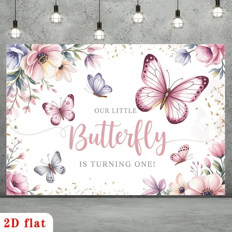 2D Flat, [party Backdrop] 2D Flat Banner, 1pc Little Butterfly First Birthday with Pink Butterflies and Pastel Flowers Polyester Backdrop, for Party Decor Farm, Garden, Home, Room, Club, No Electricity, This