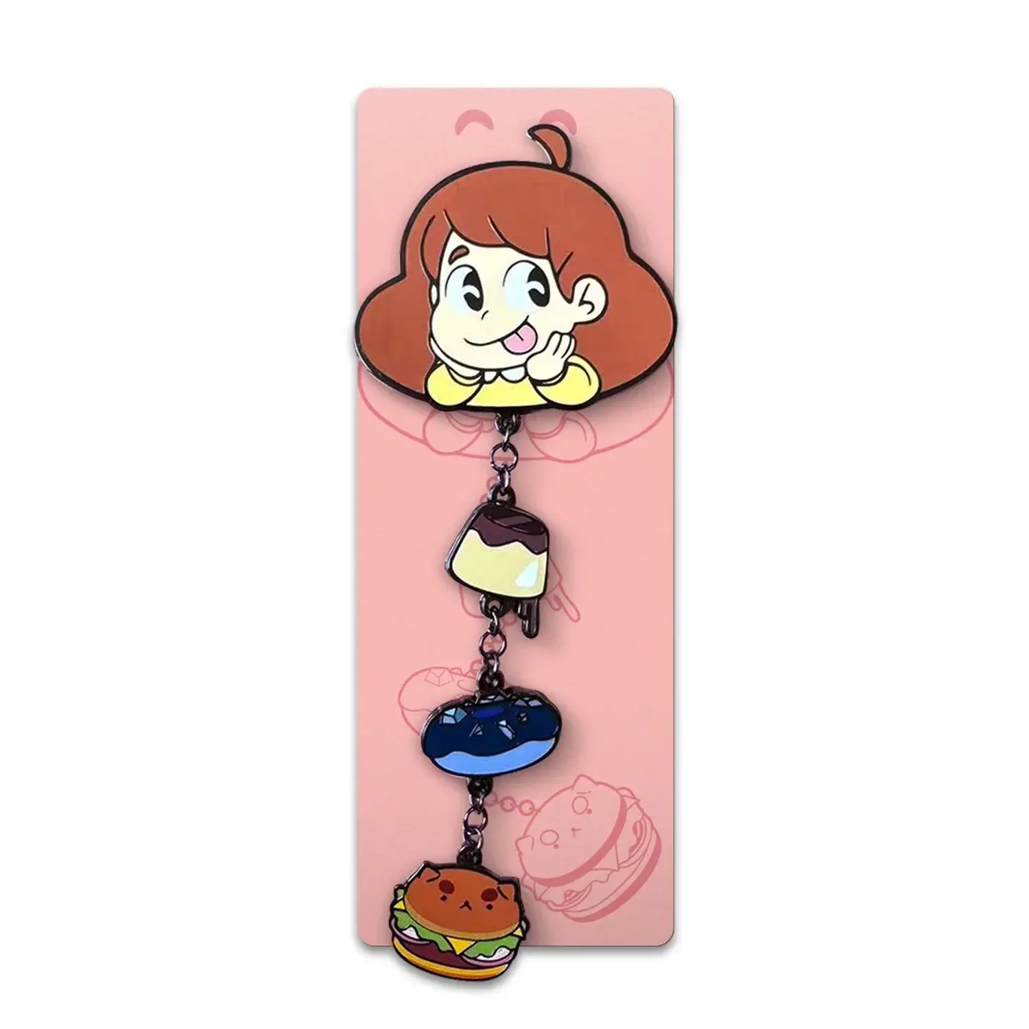 Measuring a total of 4.8 inches tall (with the chain fully extended) and gleaming with a shiny high-quality finish, this enamel pin has been designed to show Bee with her tongue sticking out and hands pressed against her cheeks as a delicious flan, jewelled donut and infinitely tasty PuppyCat burger hang below.