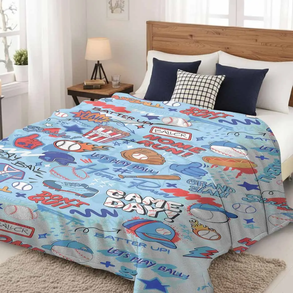 Baseball game pattern flannel blanket, sports-themed print featuring bats, baseballs, jerseys, and hot dogs, soft, comfortable, lightweight, and durable, making it a perfect gift for children.