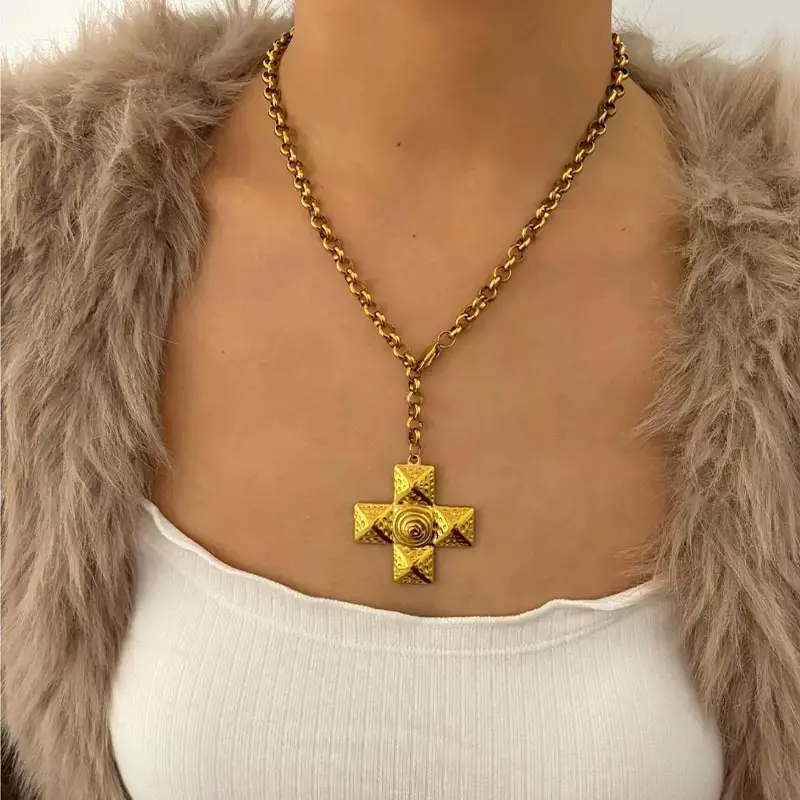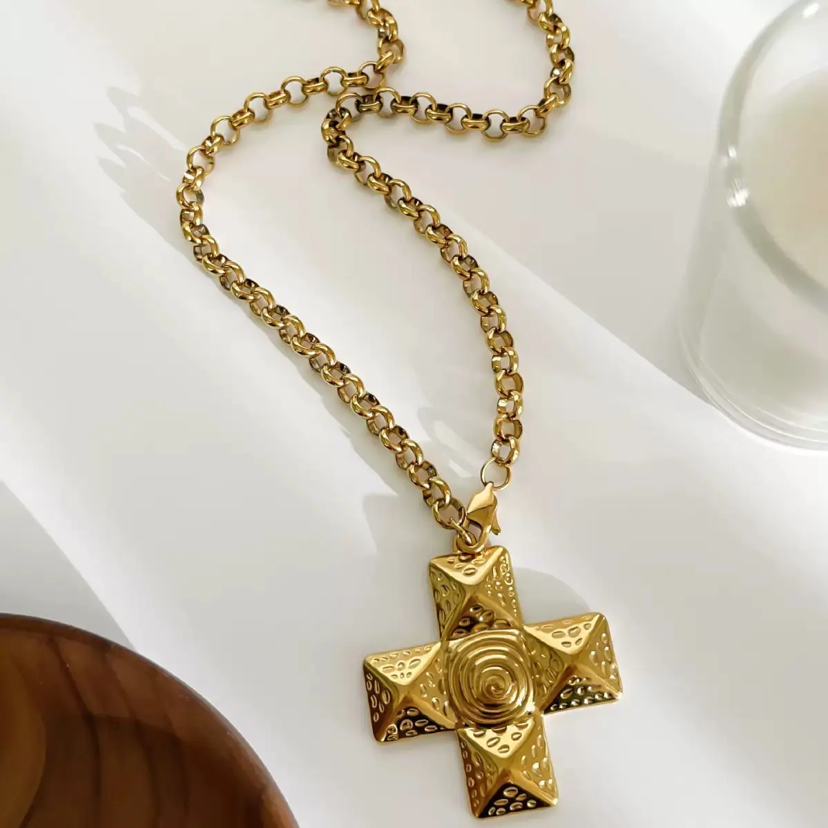 Seamlessly blending rugged industrial aesthetics with mysterious vintage symbolism, this pyramid-shaped cross pendant features a substantial, textured finish and a lustrous gold sheen.
