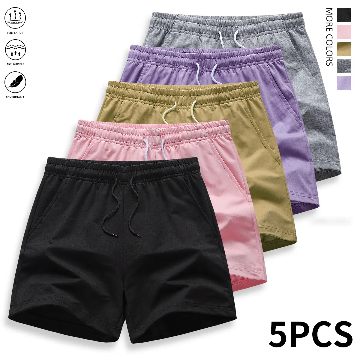 Pack of 5 women’s shorts: athletic shorts, casual shorts, solid color, drawstring elastic waistband; suitable for outdoor sports, fitness, running, and casual wear; women’s shorts, summer clothing.