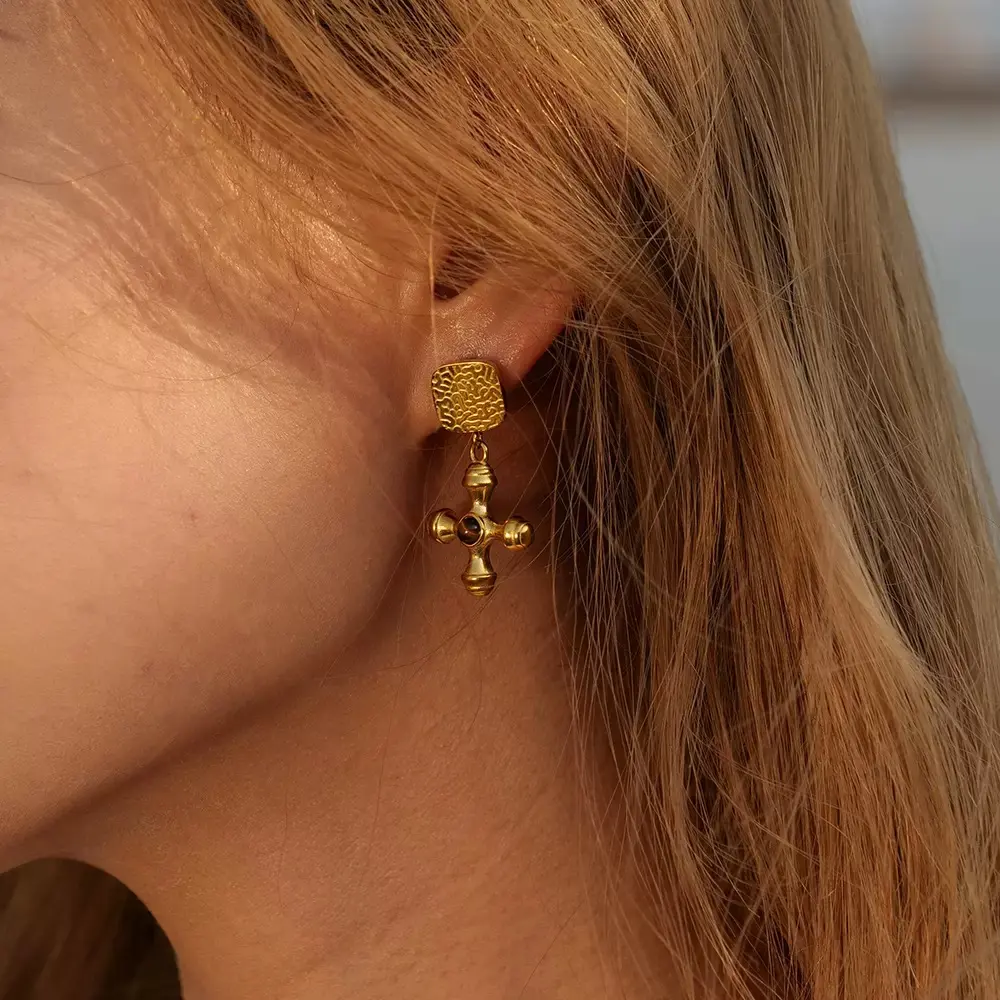 A fusion of medieval cross motifs and natural colored gemstones, these earrings feature textured gold studs paired with three-dimensional cross pendants and central gem accents, creating a distinct vintage aesthetic.