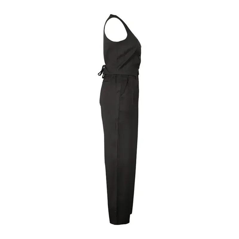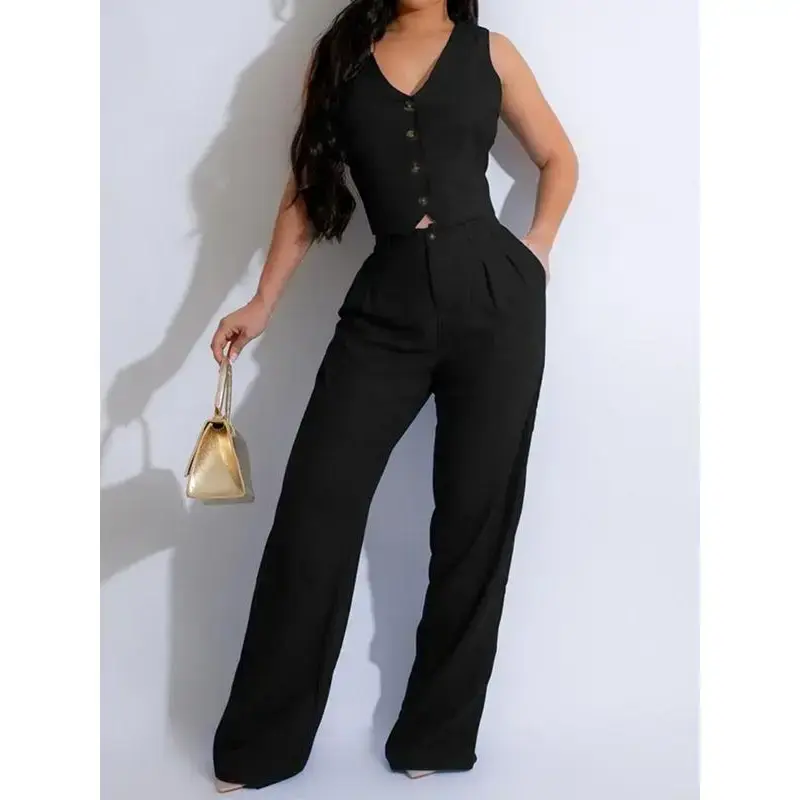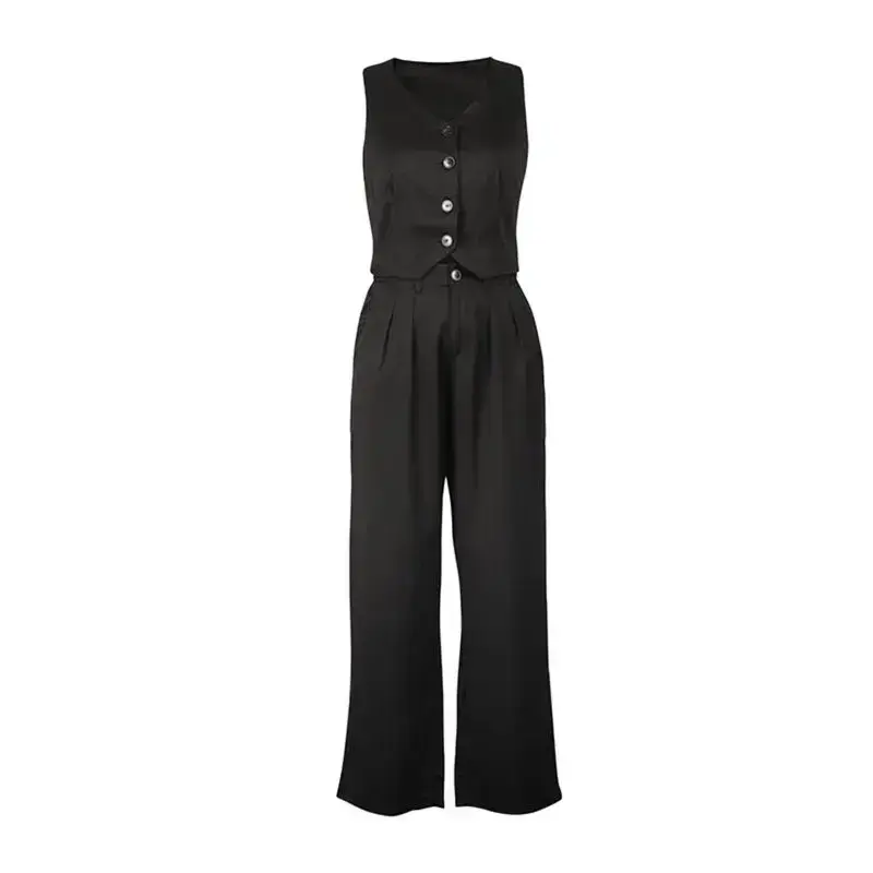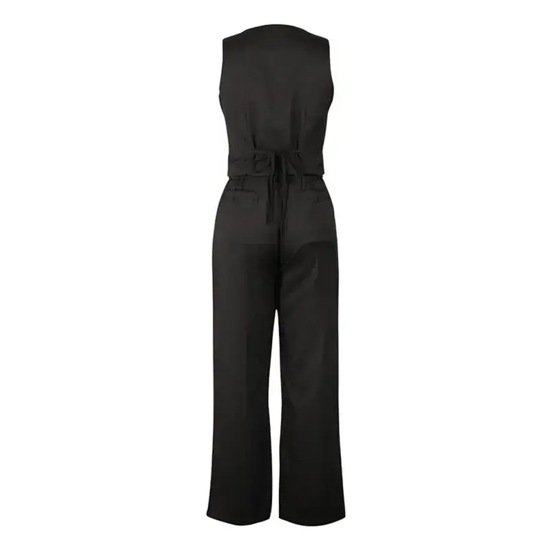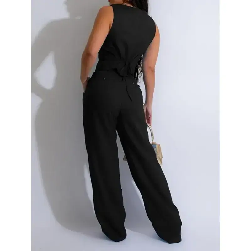 【Professional Appeal】: The button front and fitted structure elevate your work attire, providing a polished look suitable for any office environment. 【Functional Features】: Equipped with practical pockets, this set combines utility with sophistication, allowing you to carry essentials effortlessly. 【Tailored Fit】: The tie-back waistcoat allows for adjustable fitting, ensuring a personalized silhouette that complements your figure. 【Versatile Length】: Featuring long-length trousers, this ensemble is ideal for maintaining a professional appearance while ensuring coverage. 【Sleeveless Design】: The sleeveless top promotes breathability, making it perfect for warmer days while maintaining a formal appearance.