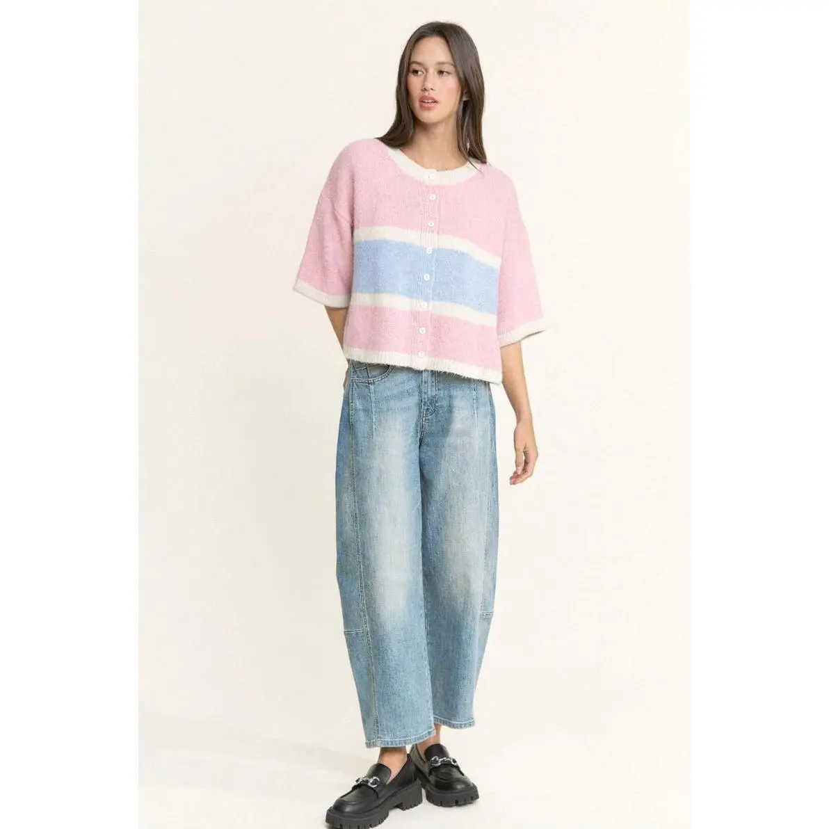 Effortless layering meets timeless style with the Lou Short Sleeve Cardi. This color block pink and blue pastel button-up transitions seamlessly from winter into spring, offering the perfect lightweight layer for unpredictable weather. Slip it on over your favorite tee or dress it up with a simple tank—versatile enough for casual days and polished enough for weekend outings. The relaxed fit and soft fabric make it a go-to piece you'll reach for again and again.