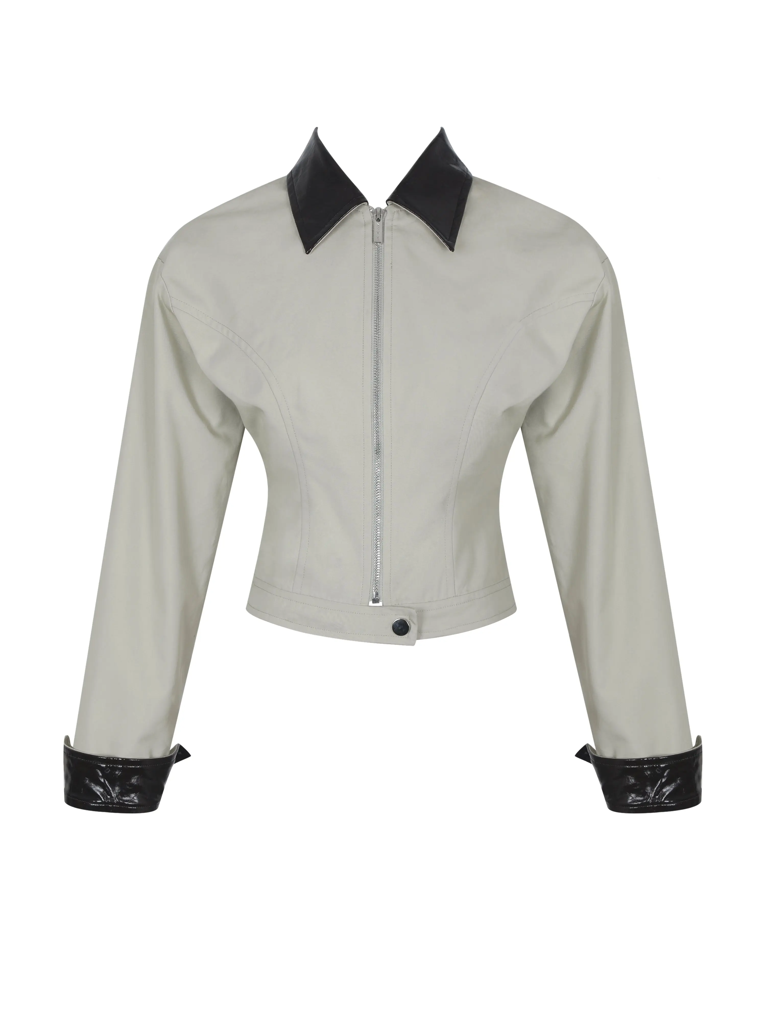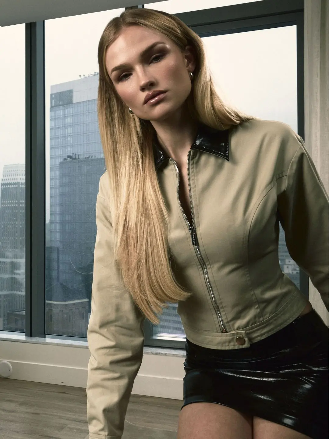 Polished with a modern attitude, this Vinette sage green zip-up jacket brings refined structure to spring layering. Designed with a perfectly cropped length, it features a rich mocha faux leather collar and matching cuffs for contrast and sophistication. Silver snap-closure hardware adds an elevated, contemporary finish, while slightly oversized sleeves create a relaxed yet intentional silhouette. Fully lined for comfort and a smooth fit, the jacket pairs effortlessly with the matching Vivian low-rise mini skirt for a coordinated look that feels bold and fashion-forward. Ideal for spring city days, casual-chic dinners, rooftop outings, or styled separately for versatile wear, this set blends soft color with sleek confidence.