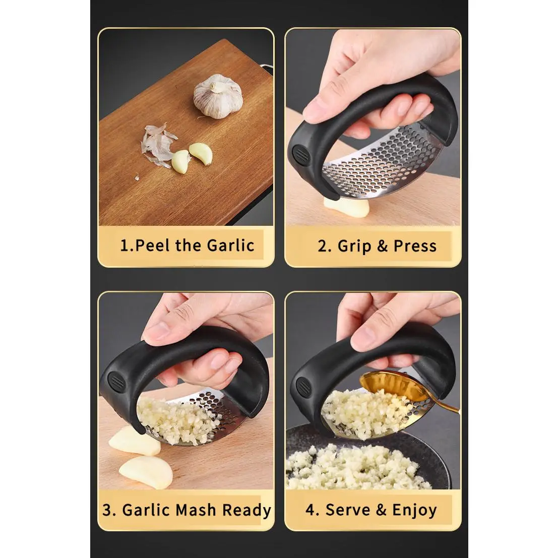 Zulay Kitchen Garlic Press Rocker Set - Stainless Steel Garlic Crusher, Minces Cloves, Includes Silicone Peeler & Scraper - Essential Kitchen Utensil