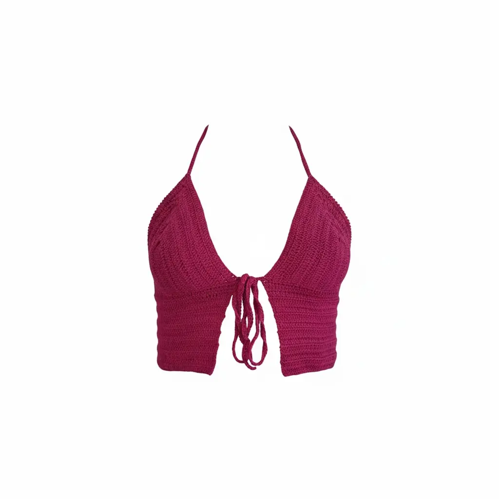 This crop top is a handmade crochet halter top in a vibrant pink color, perfect for a casual occasion. The tie front closure and halter neckline add a stylish touch to this sleeveless top, which is made of acrylic material. The cropped style and regular fit make it a trendy and comfortable choice for the summer season. Made by Albatrosses Crochet in the United States, this unique piece is sure to make a statement with its crochet accents and cropped design.