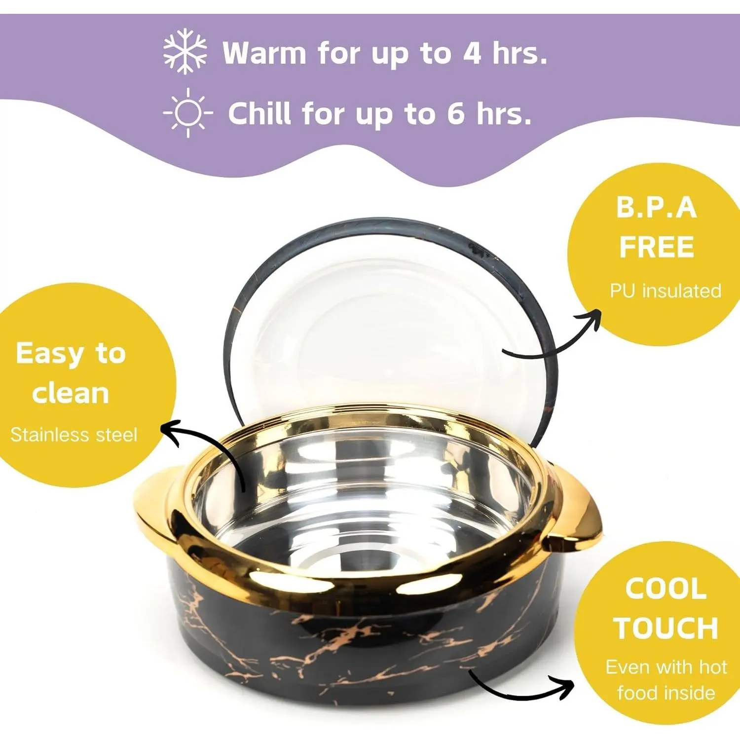 Make every meal a standout experience - transform ordinary dishes into extraordinary dining experiences. Our beautifully designed and elegantly colored tableware is sure to add brilliance to your dining table, making every occasion seem special. Capacity: 2.6/2.1/1.6 quarts Lock in freshness and deliciousness: Use the Hywisnok insulated bowl to keep your food at the ideal temperature for hours - no need to reheat! Control your meal times at any time - Our multifunctional bowl is designed for the dynamic lifestyles of modern mothers and savvy home cooks, making it a reliable assistant in ensuring that your homemade dishes remain delicious from the kitchen to the table Lightweight and Portable: Our insulated bowl is easy to use and carry, making it ideal for dining on the go and traveling, allowing you to enjoy convenience wherever you are Easy and convenient to use: With a comfortable handle and a cool exterior surface, you can easily move these bowls from the kitchen counter to the dining table Stylish and practical, suitable for various occasions: Impress your guests with these fashionable bowls, perfect for holiday gatherings, dinner parties, and get-togethers Boost your dining health index - embrace the future of healthy eating! Our advanced insulated bowl can keep your food at the perfect temperature, whether it's heated or chilled, preserving its nutrients and taste without the need for a microwave