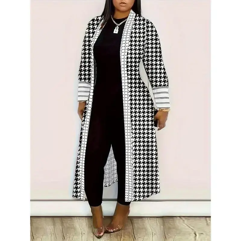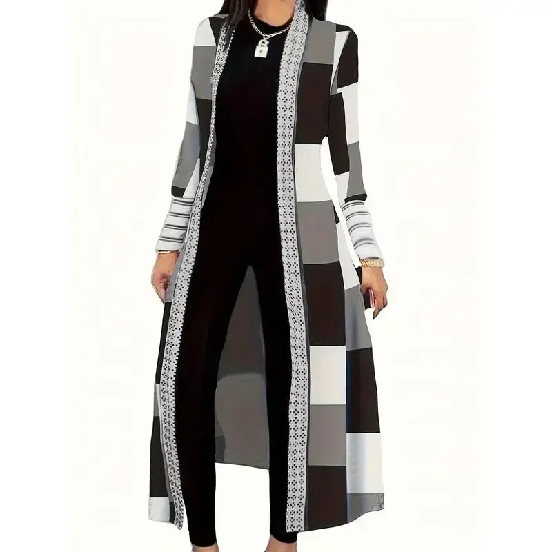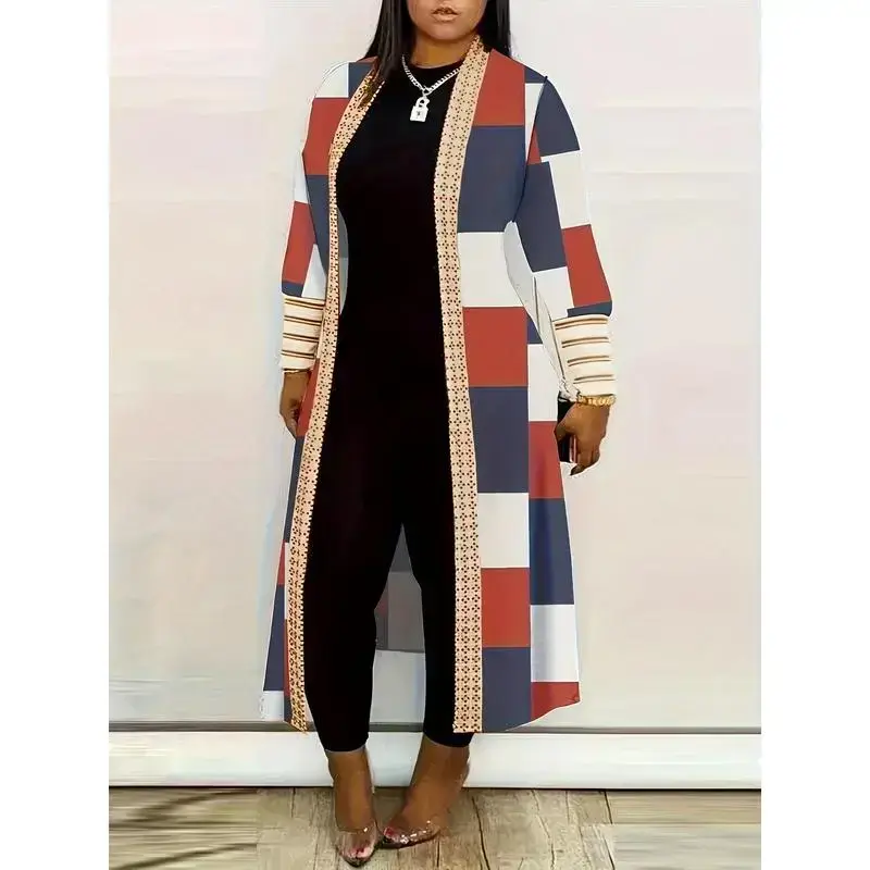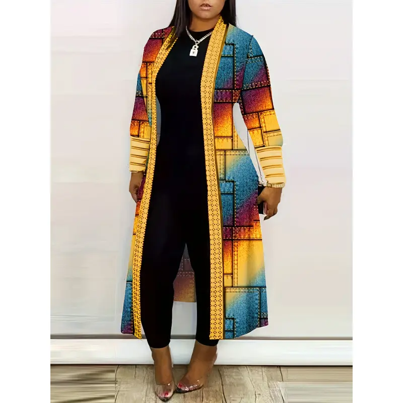 Color Block Geometric Print Cardigan, Casual Long Sleeve Open Front Long Cardigan, Women's Fashion