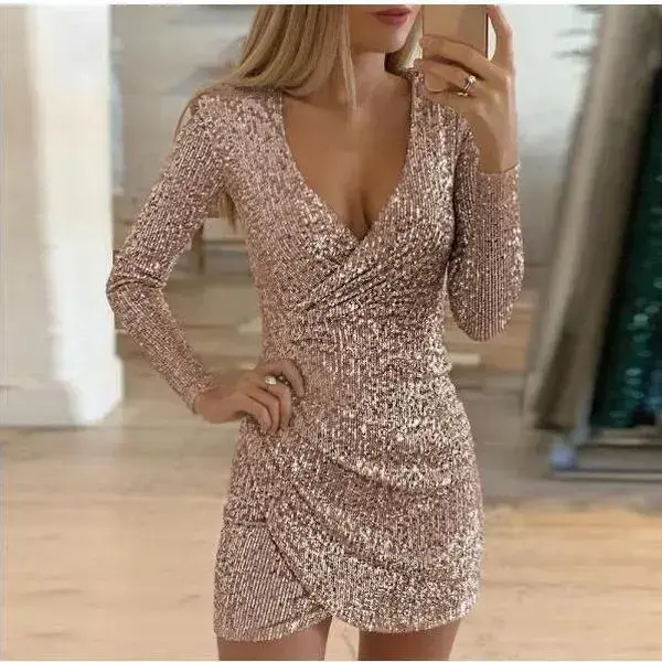 Women's Deep V-neck Sequin Shiny Unique Dress XS-5XL