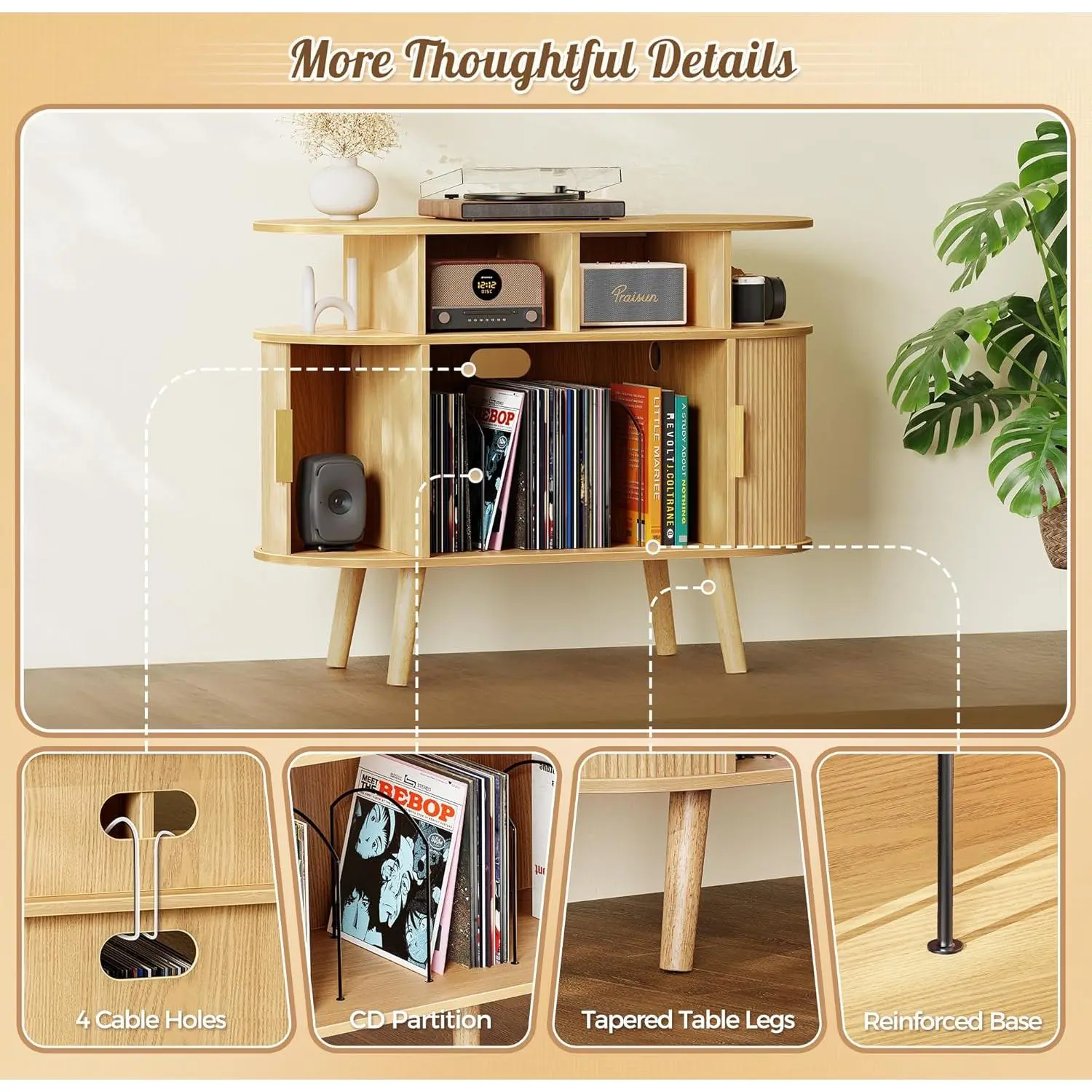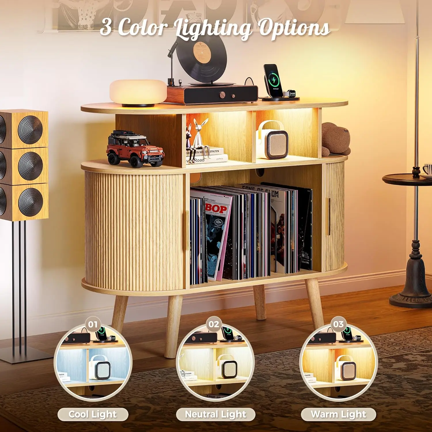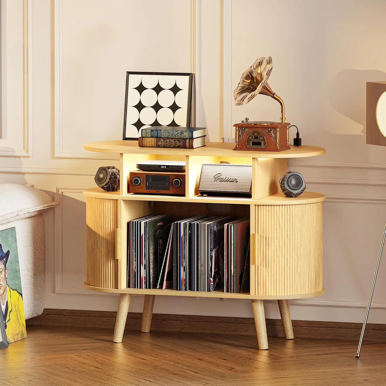 35.4 Inch Record Player Stand with Power Outlets & 3-Color Lights, Vinyl Record Stand with 2 Fluted Cabinets, USB-C Port, Mid Century Modern Player Stand, Open Storage, Natural