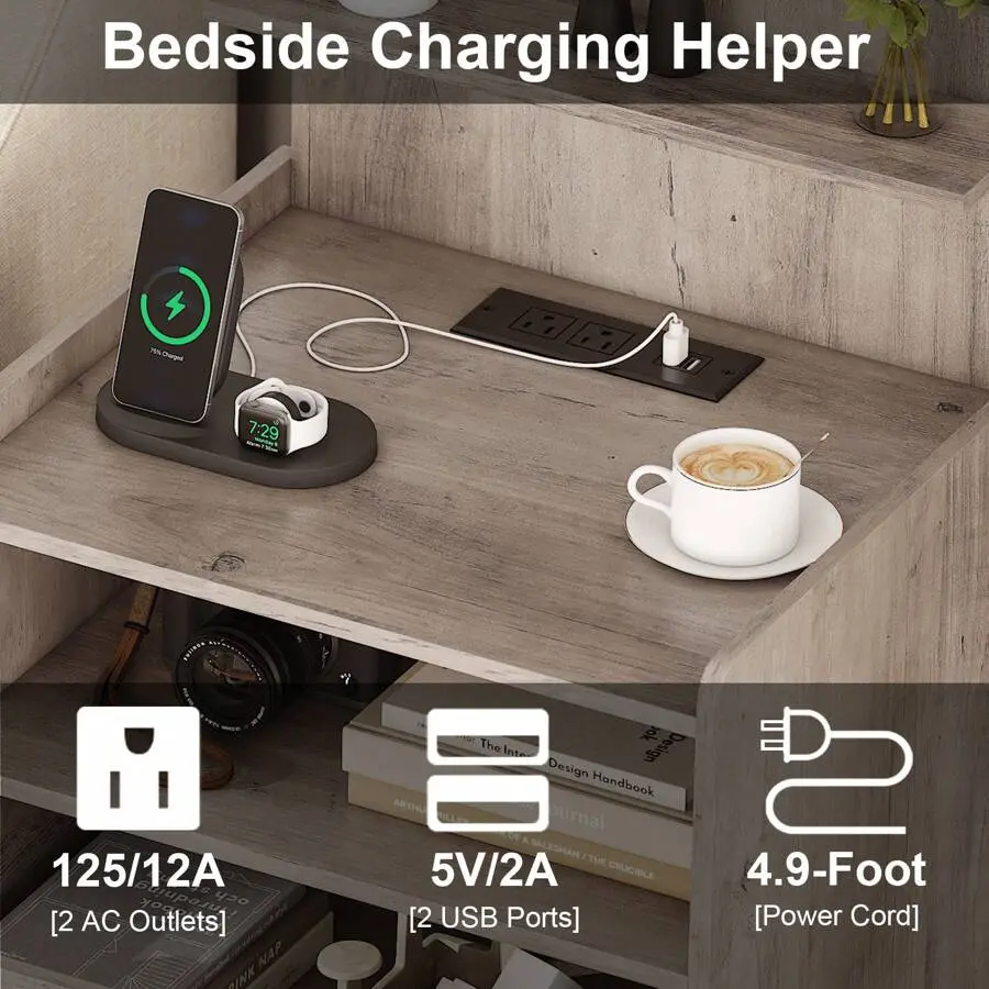 Designed for convenience, this nightstand comes with a built-in charging station, featuring 2 standard plug outlets and 2 USB ports.You can charge your phone, tablet, lamp, and other electronic devices simultaneously, eliminating the hassle of searching for nearby outlets.The 4.9ft long power cord adds flexibility, allowing you to place the nightstand anywhere in your room without being limited by socket location-enjoy the convenience of power right at your bedside.