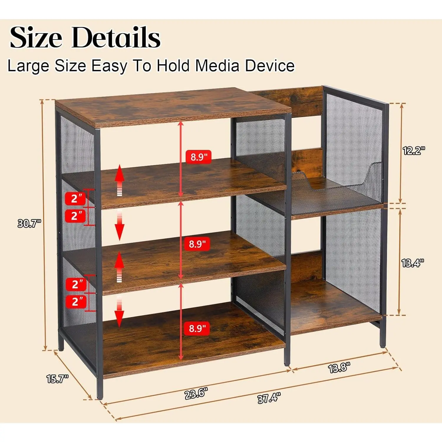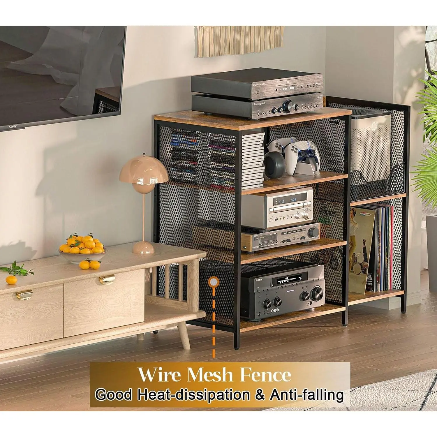 Large record player stand, can hold up to 150 vinyl records, AV media stand with stereo cabinet, features storage function, sturdy and durable, adjustable foot pads, vintage style, large capacity