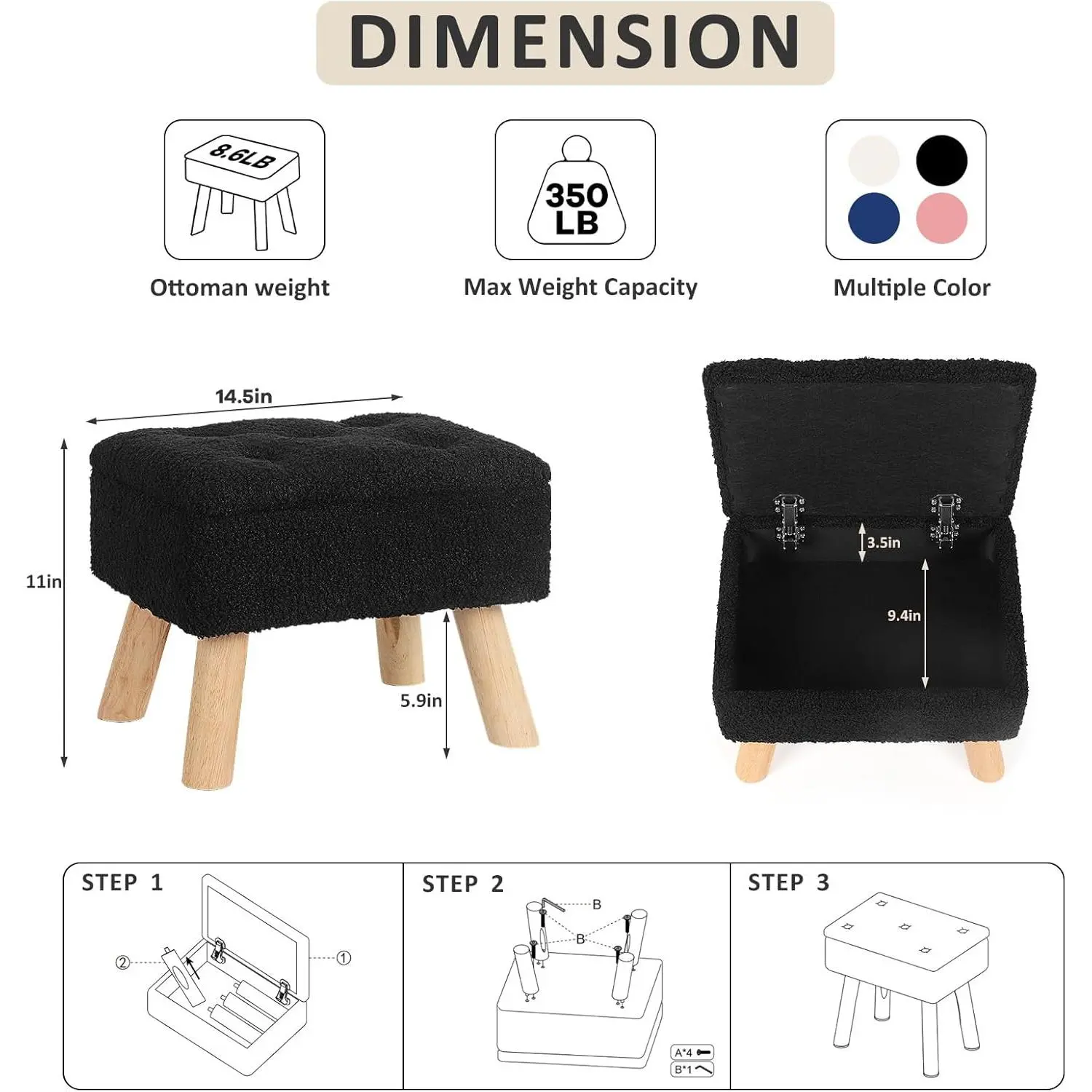 Footstool with storage function, small footstool with storage space, suede teddy velvet footrest, with cushioned seat, sturdy wooden legs, suitable for living room, bedroom, sofa, entryway (black)