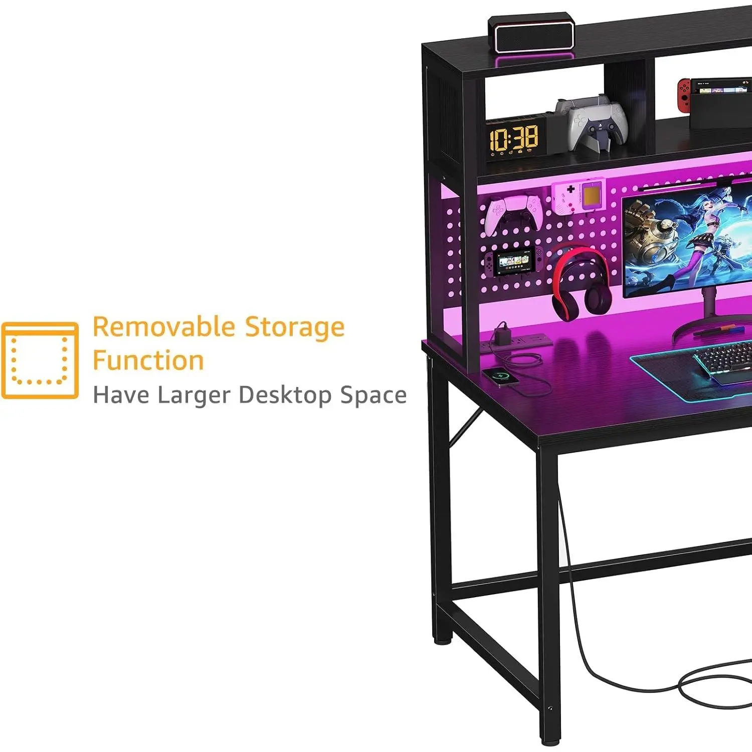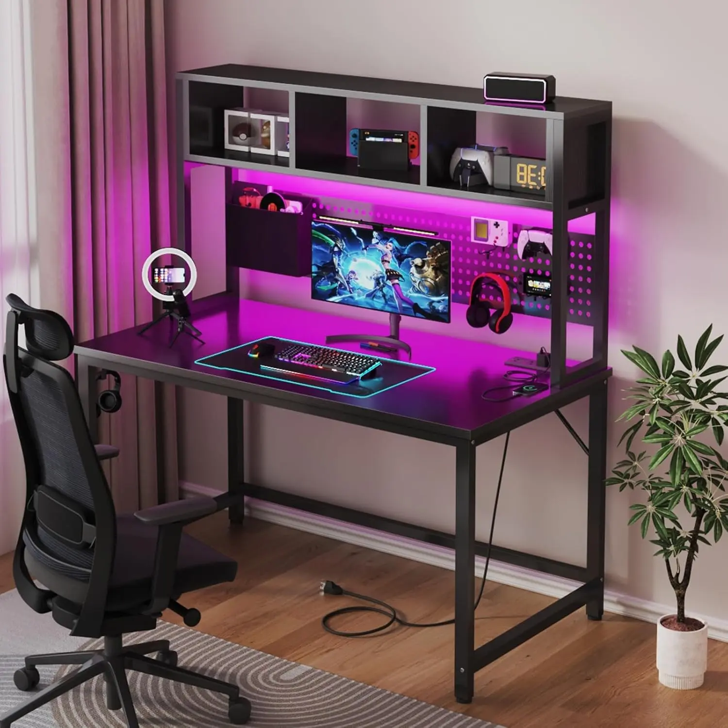 Black gaming desk with storage cabinet and perforated panel - 47inch gaming desk, equipped with storage shelves and power outlets, suitable for teenagers to study, work, and write, ideal for bedrooms and home offices