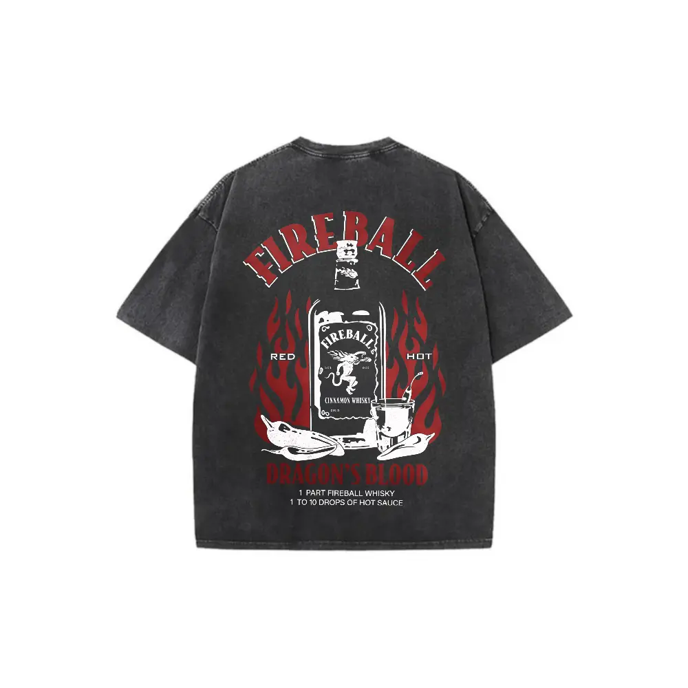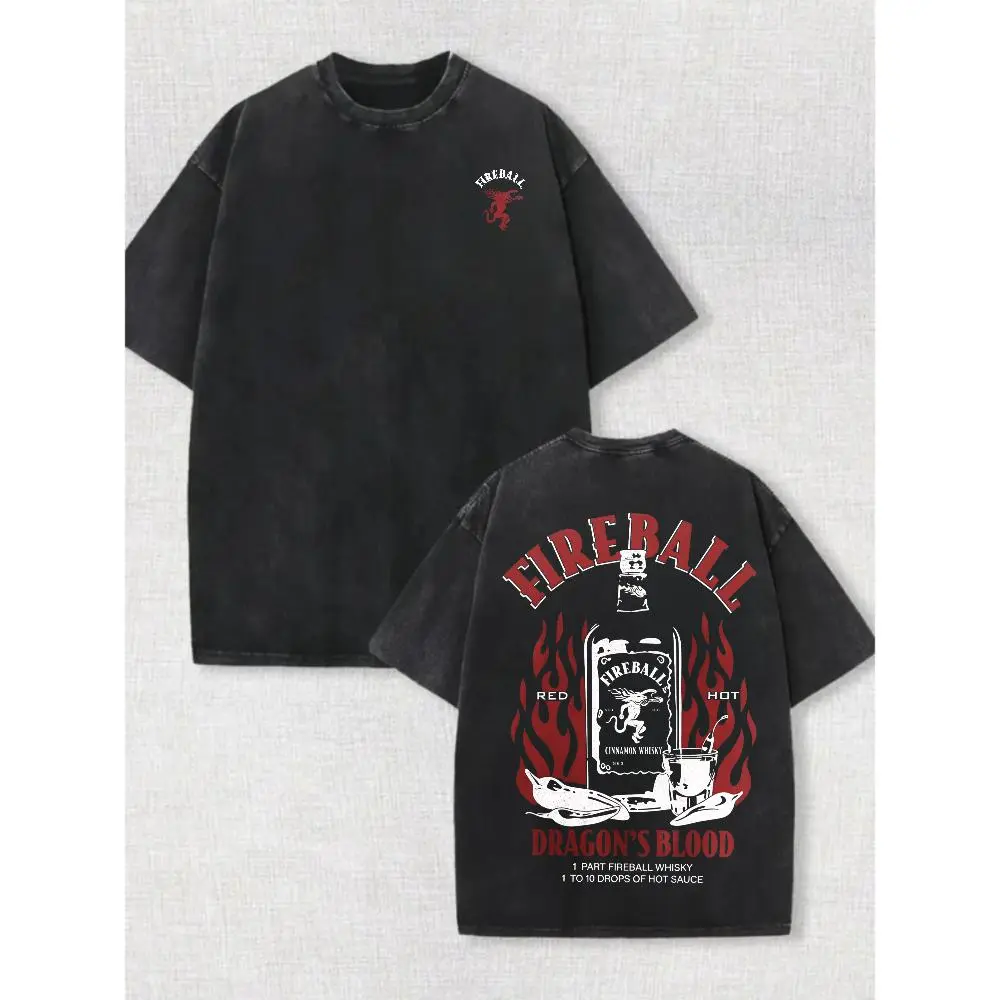 Fireball Dragon Blood Graphic Vintage Washed Cotton T Shirt Mens Oversized Streetwear Crew Neck Short Sleeve Casual Tee for Daily Wear Hip Hop Y2K Fashion Retro Print Urban Style Motorcycle Biker Top with Flame Design Breathable Soft Comfort Fit