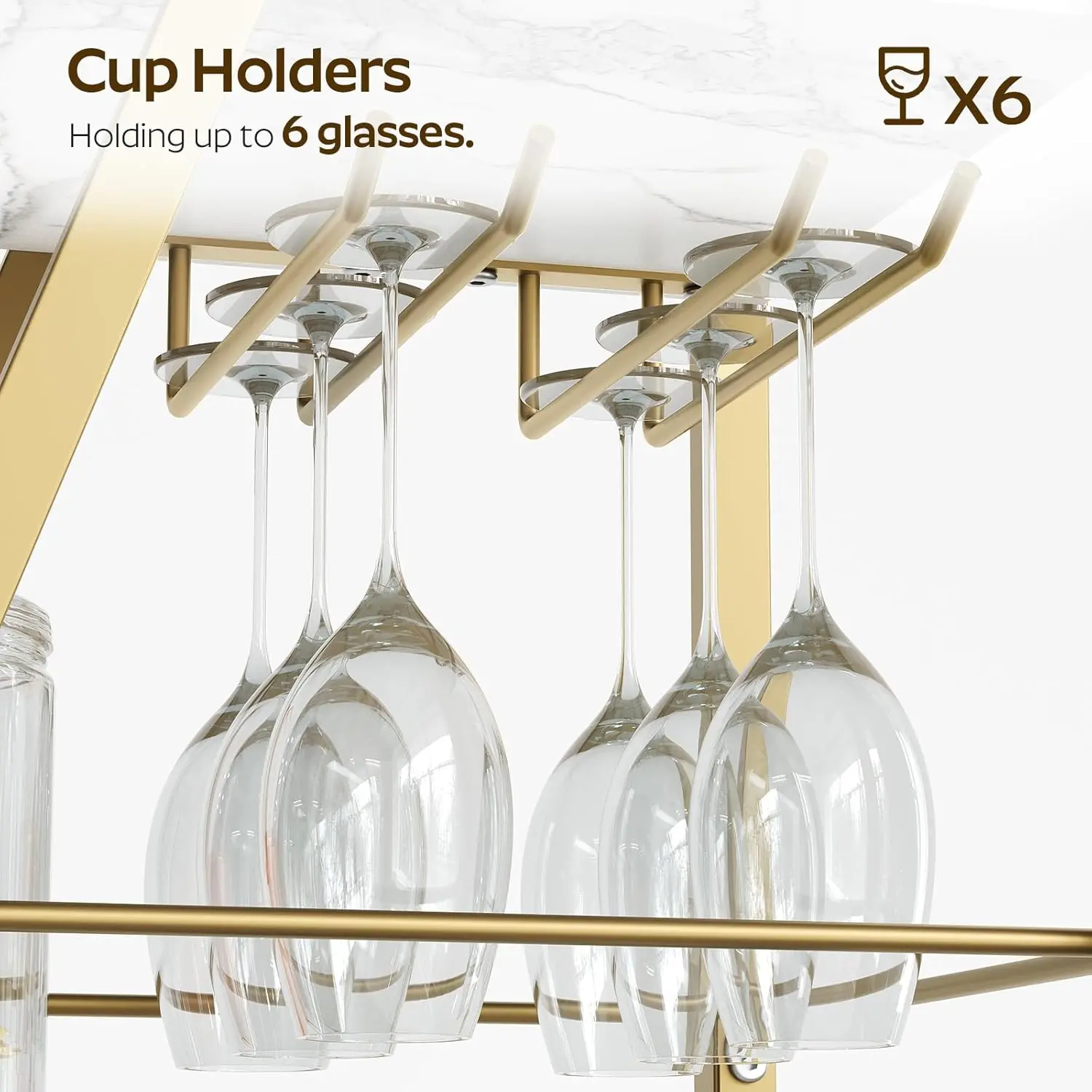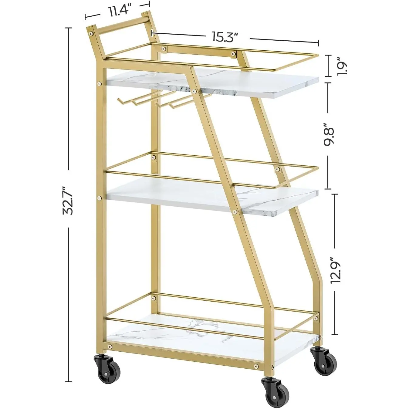 Bar cart, home-use gold bar cart, small bar cart with wheels, beverage cart, home bar service cart with glass cup holder, bar kitchen beverage cart, marble white and gold