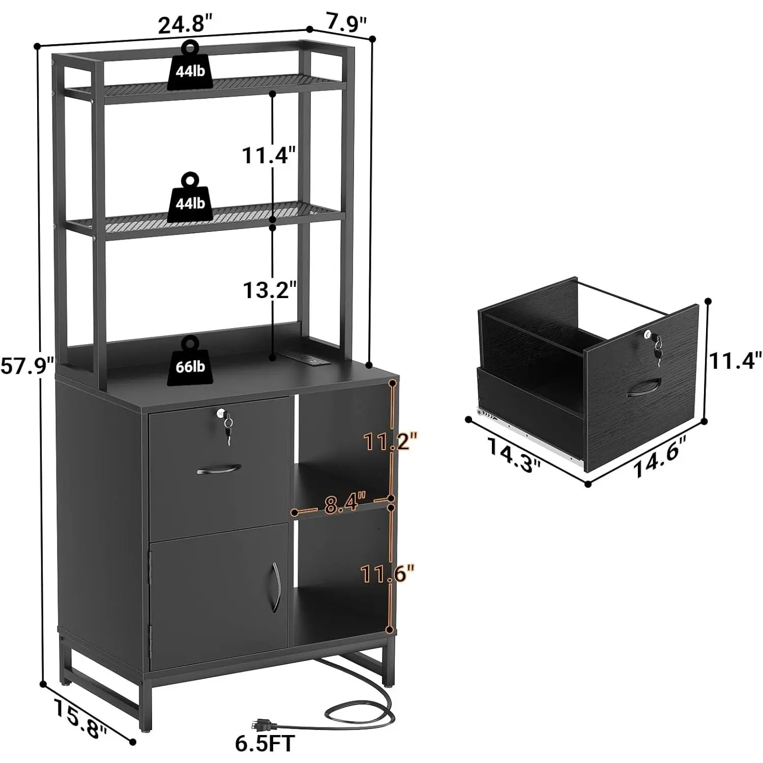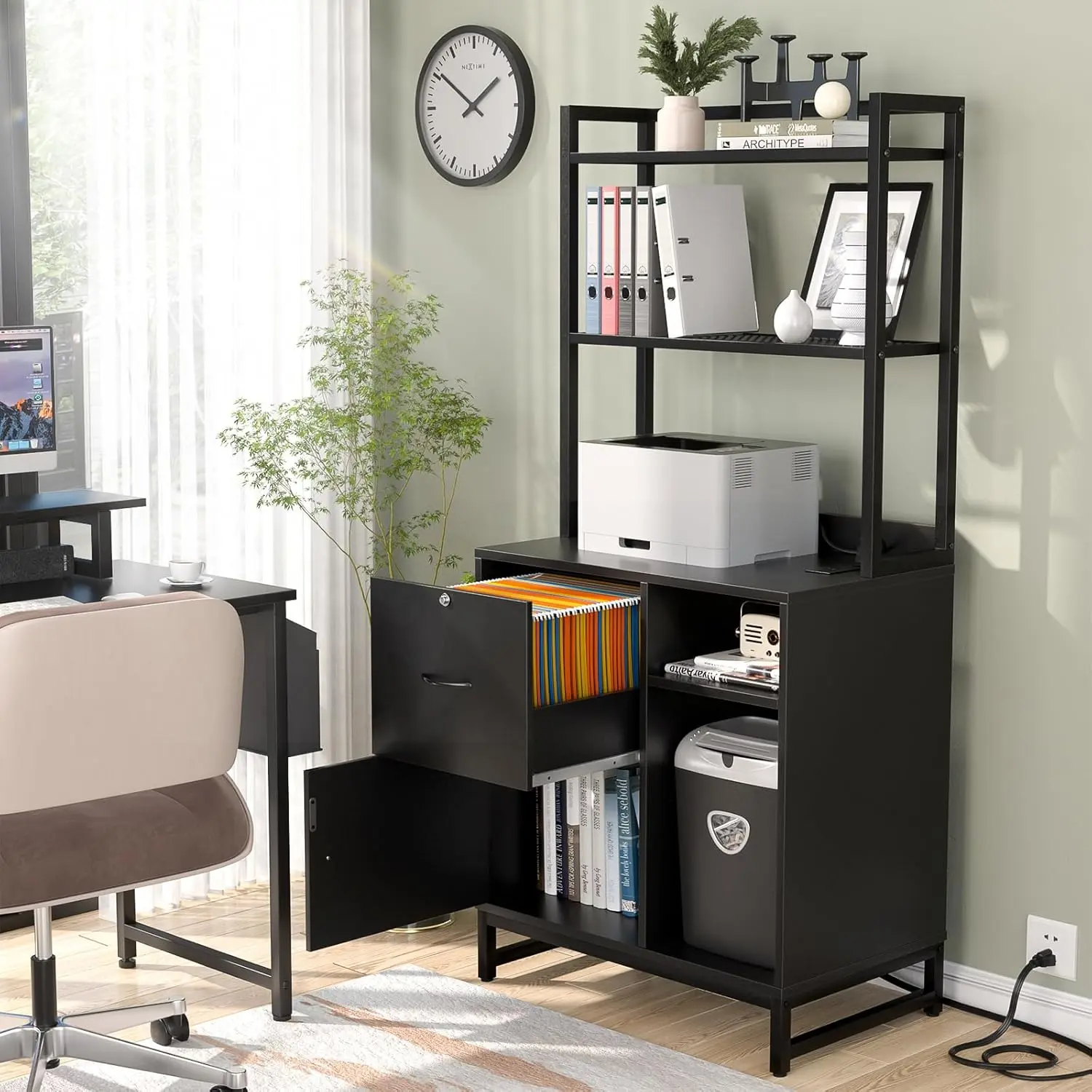 Vertical Filing Cabinet with Bookshelf for Home Office, File Cabinet with Shelves, Lock & Charging Station, Drawer Office File Cabinets with Printer Stand, fits Letter Size, Black