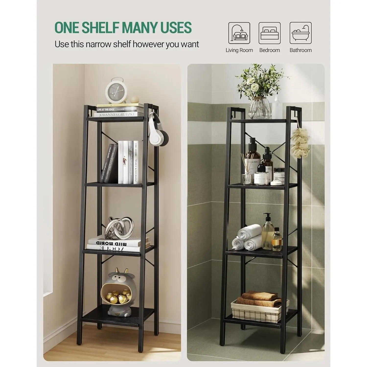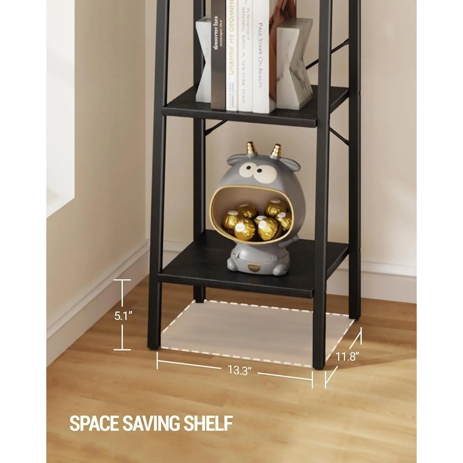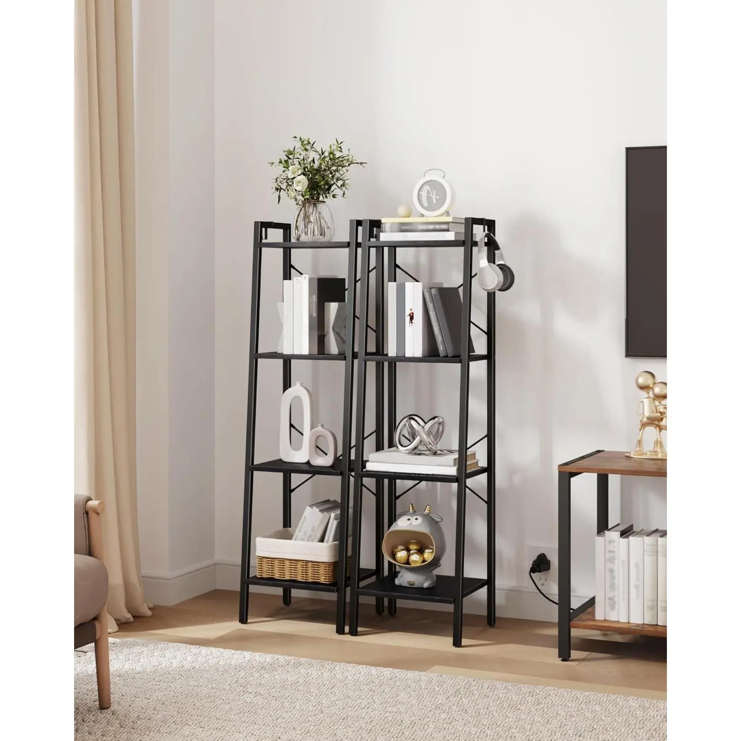 Ladder Shelf, Bookshelf Bookcase, Freestanding Corner Storage Shelve with 2 Hooks for Home Office, Living Room, Kitchen, Bedroom, Industrial, 11.8" D x 13.4" W x 47.2" H, Black