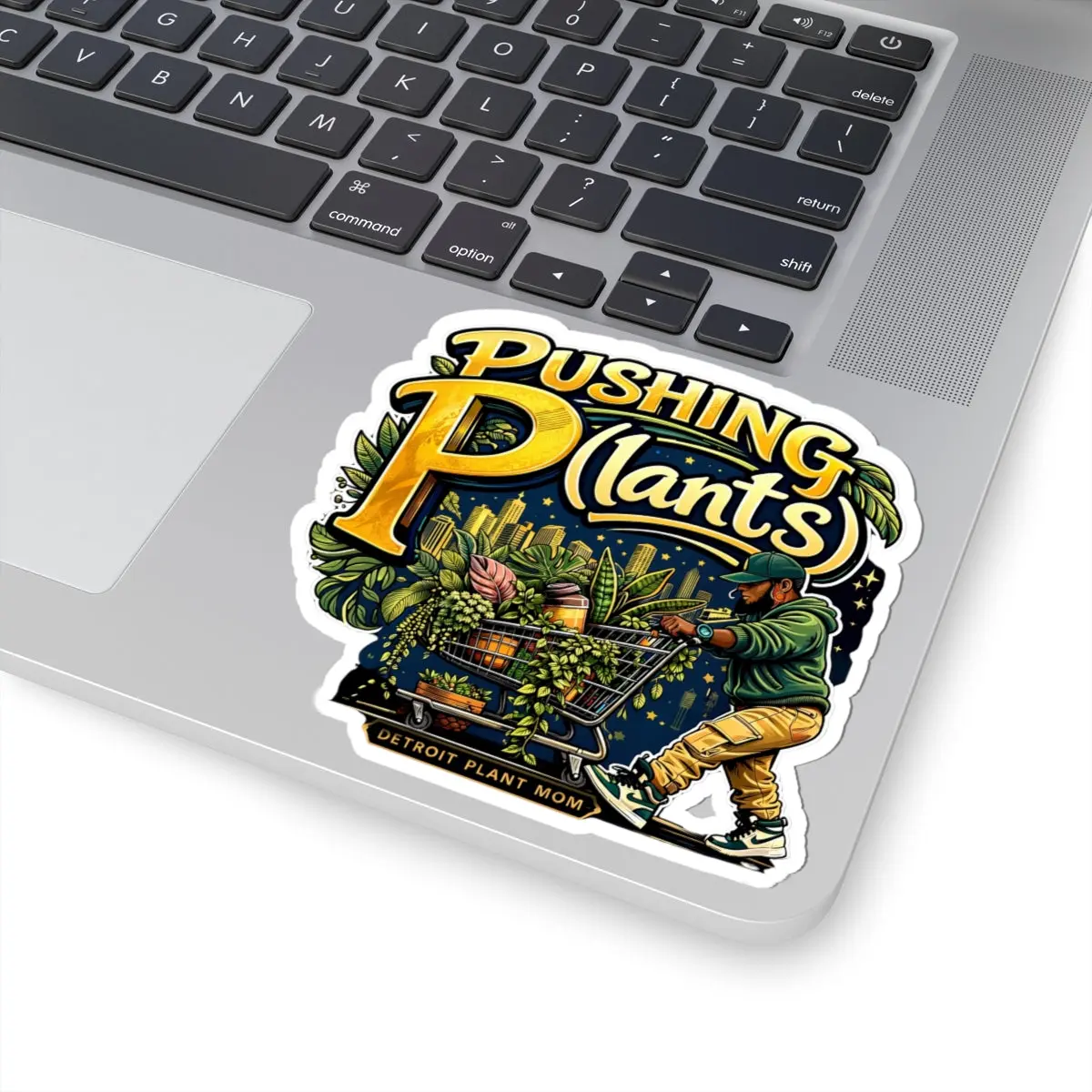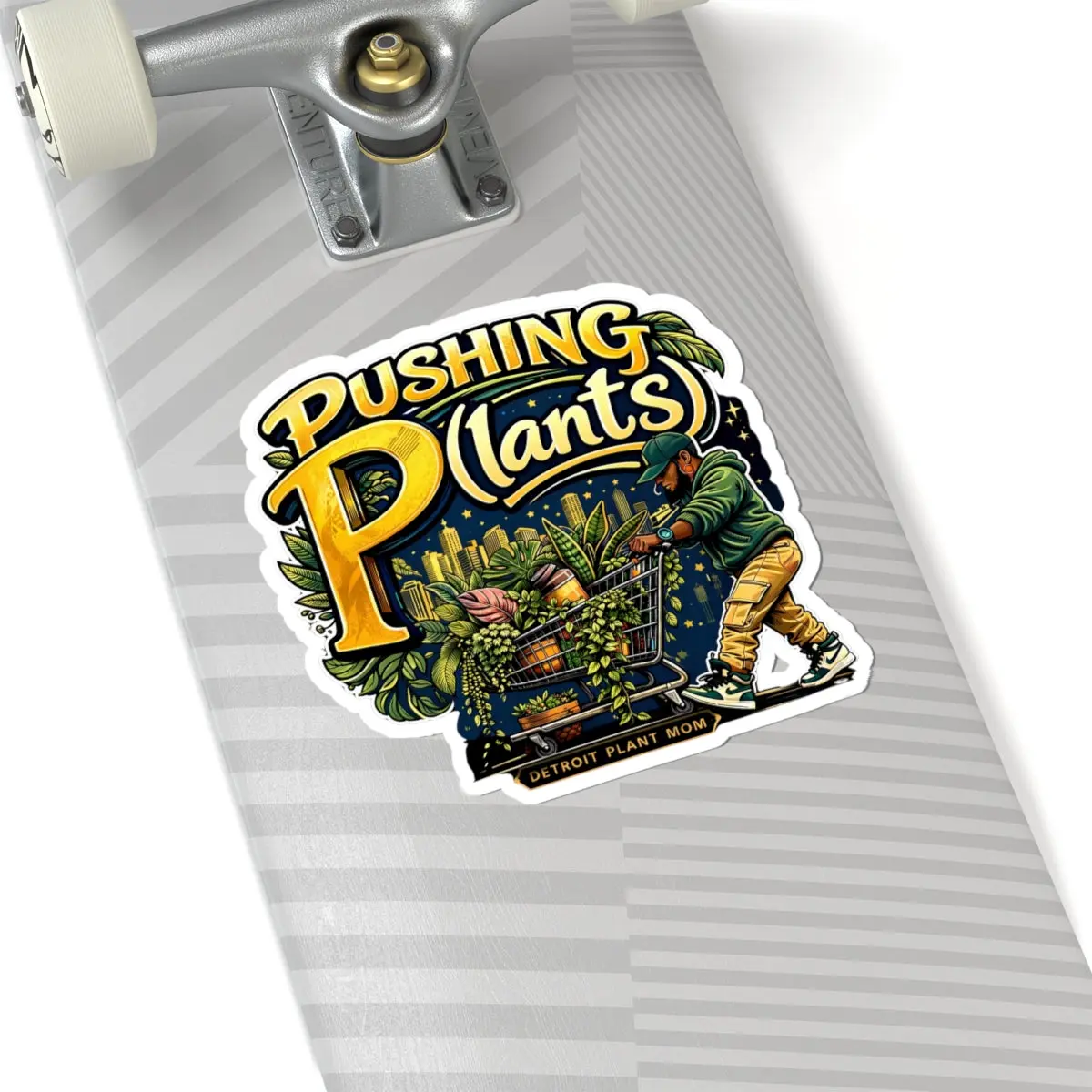 This glossy kiss-cut sticker brings playful personality to any flat surface. A bold, colorful illustration shows a figure pushing a cart overflowing with lush houseplants beneath a glowing city skyline, with hand-lettered “Pushing Plants” lettering that pops in rich golds and deep greens. The finish is shiny and scratch-resistant, so the vibrant inks stay vivid on laptops, journals, water bottles (indoor use), and window displays. It’s made from durable vinyl with a strong permanent adhesive for smooth, bubble-free application, and comes in white or transparent backing and four size options to suit your space. The sticker leans into urban plant-parent energy — a small, joyful piece of décor that celebrates city greens and plant care rituals.