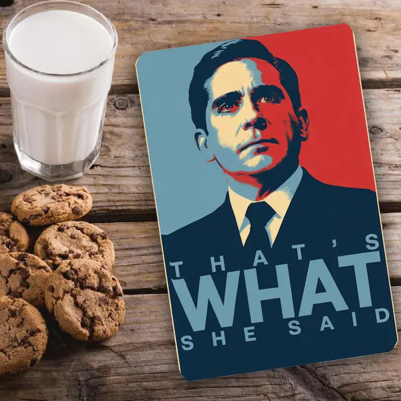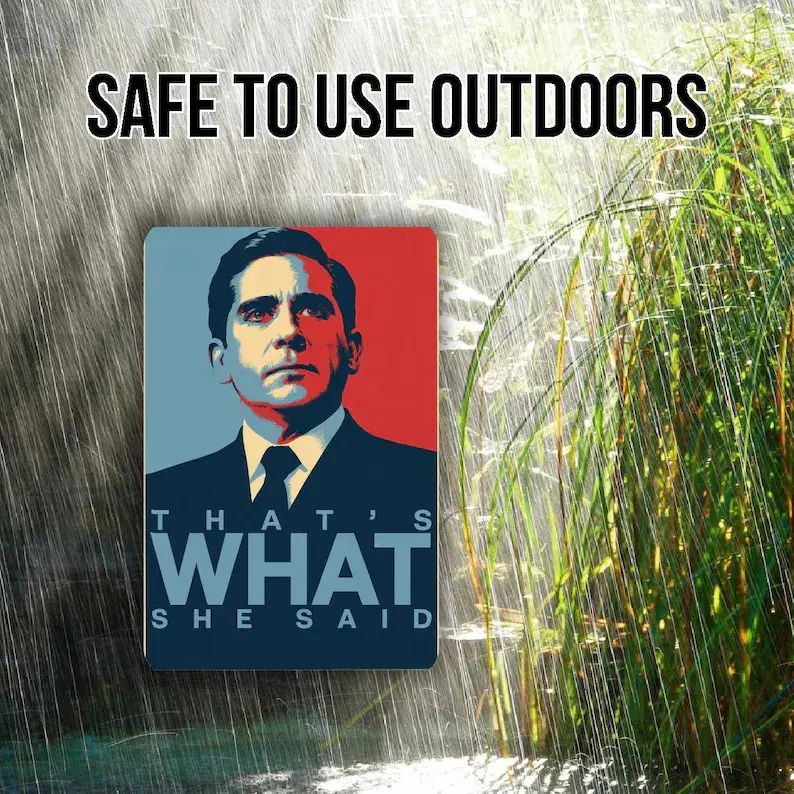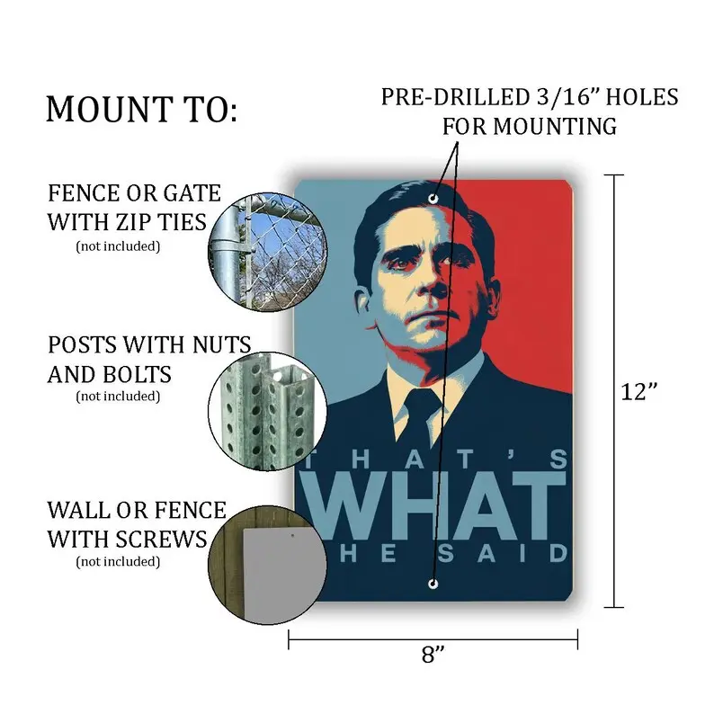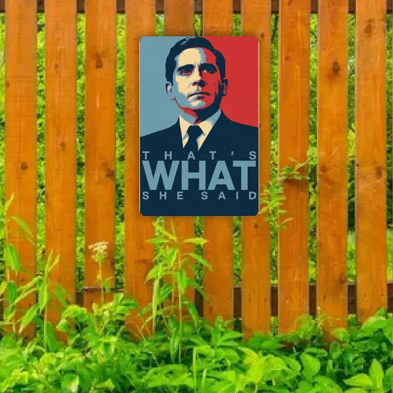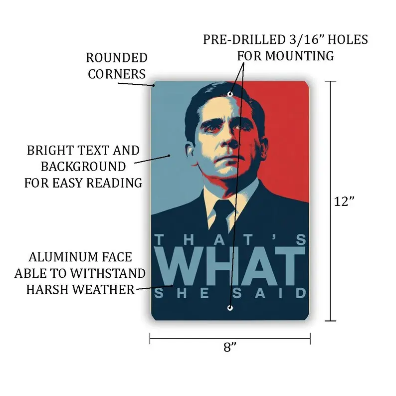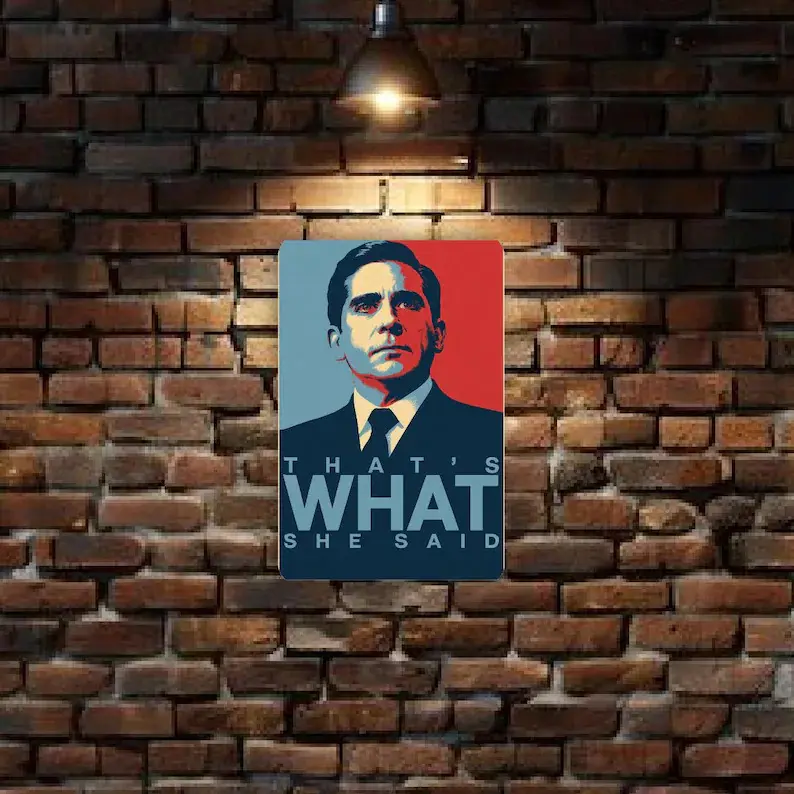 Bring bold design and irreverent humor together with this eye-catching metal sign featuring the iconic phrase: "That’s What She Said."Styled as a parody of the famous Obama campaign poster, this 8"x 12" novelty sign combines political art aesthetics with pop culture wit.The central figure-a man in a black suit and tie-is illustrated in a dramatic, minimalist style, using strong shadows and clean lines to evoke the look of a heroic campaign portrait.