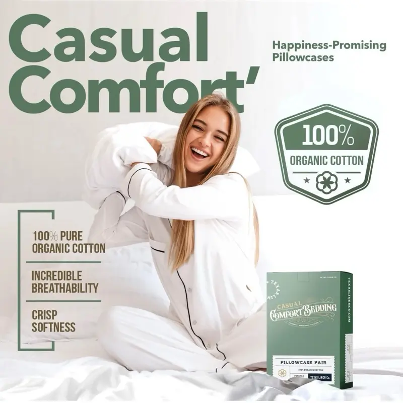 TEXAS LINEN CO. 100% Organic Cotton Percale Pillow Cases Standard/Queen Size Set
