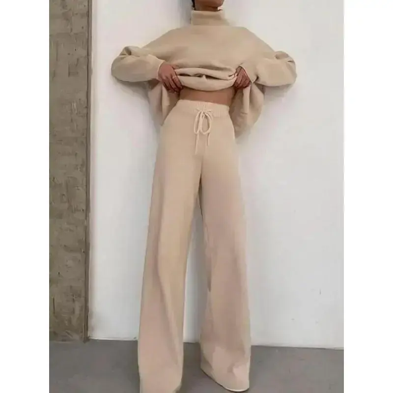 Women's Solid Turtleneck Tops & Wide Leg Pants Set, Casual Fashionable Cozy Long Sleeve Top & Trousers for Daily Casual Occasion Wear, Fall Clothes, 2 Piece Set, Women's Clothing for Fall, Downtown Girl Clothes Womenswear