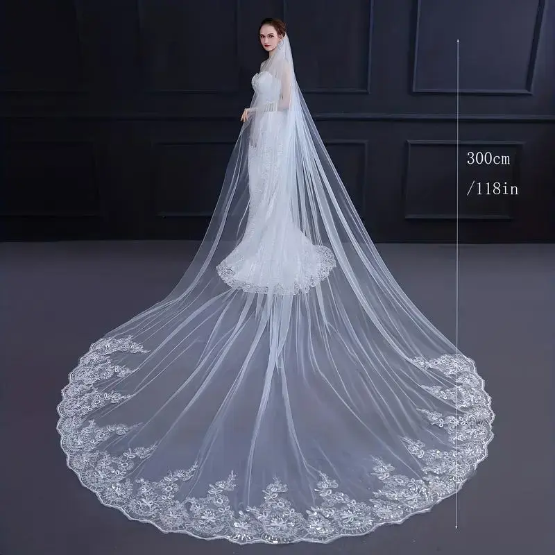 1pc Bridal Wedding Veil, Elegant Polyester and Spandex Long Headpiece with Floral Lace Edge, Classic Bride Hair Accessory with Comb, Delicate Details