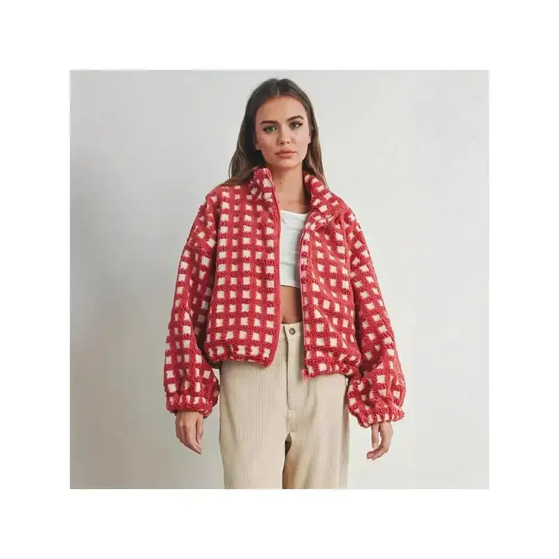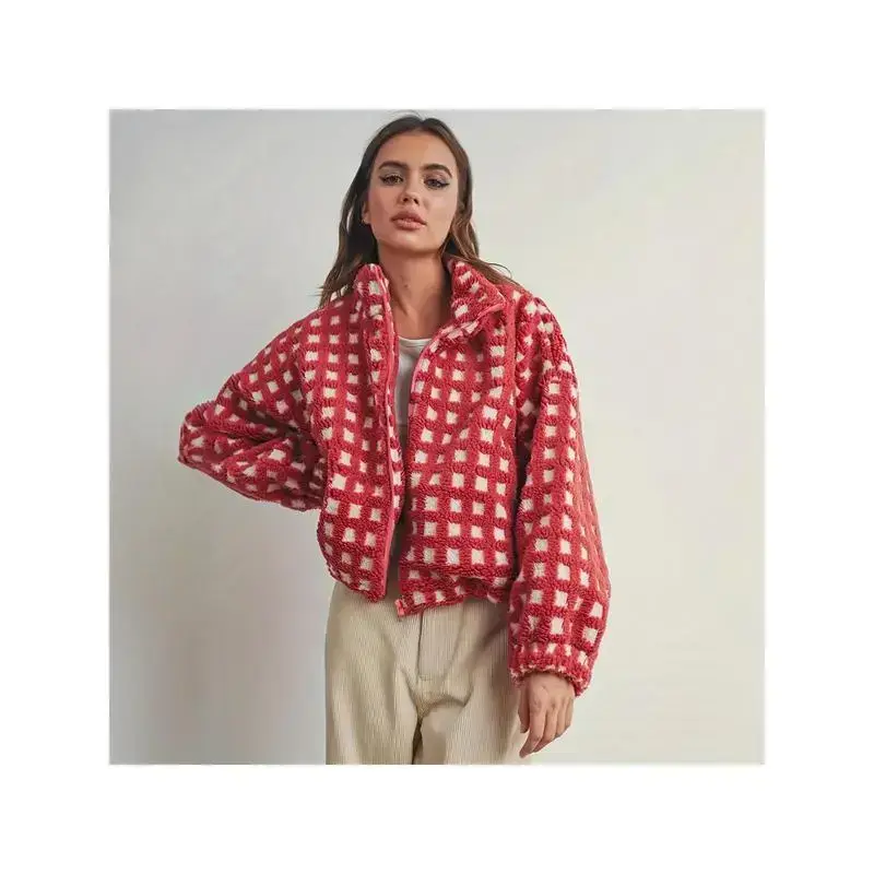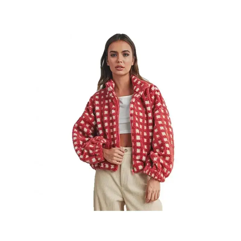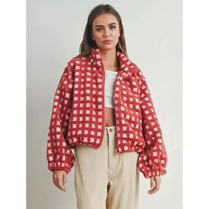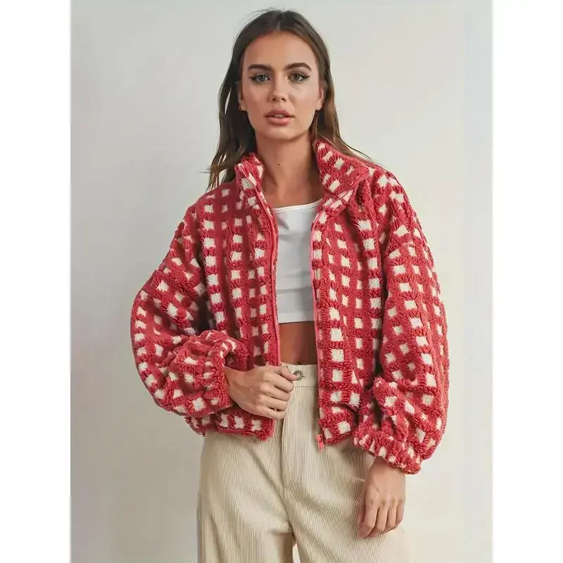 Women'sPlushRedandWhiteHoundstoothCoat-WarmLongSleeveJacketwithCollar,CasualtoFormalOuterwearTopsWomenswear