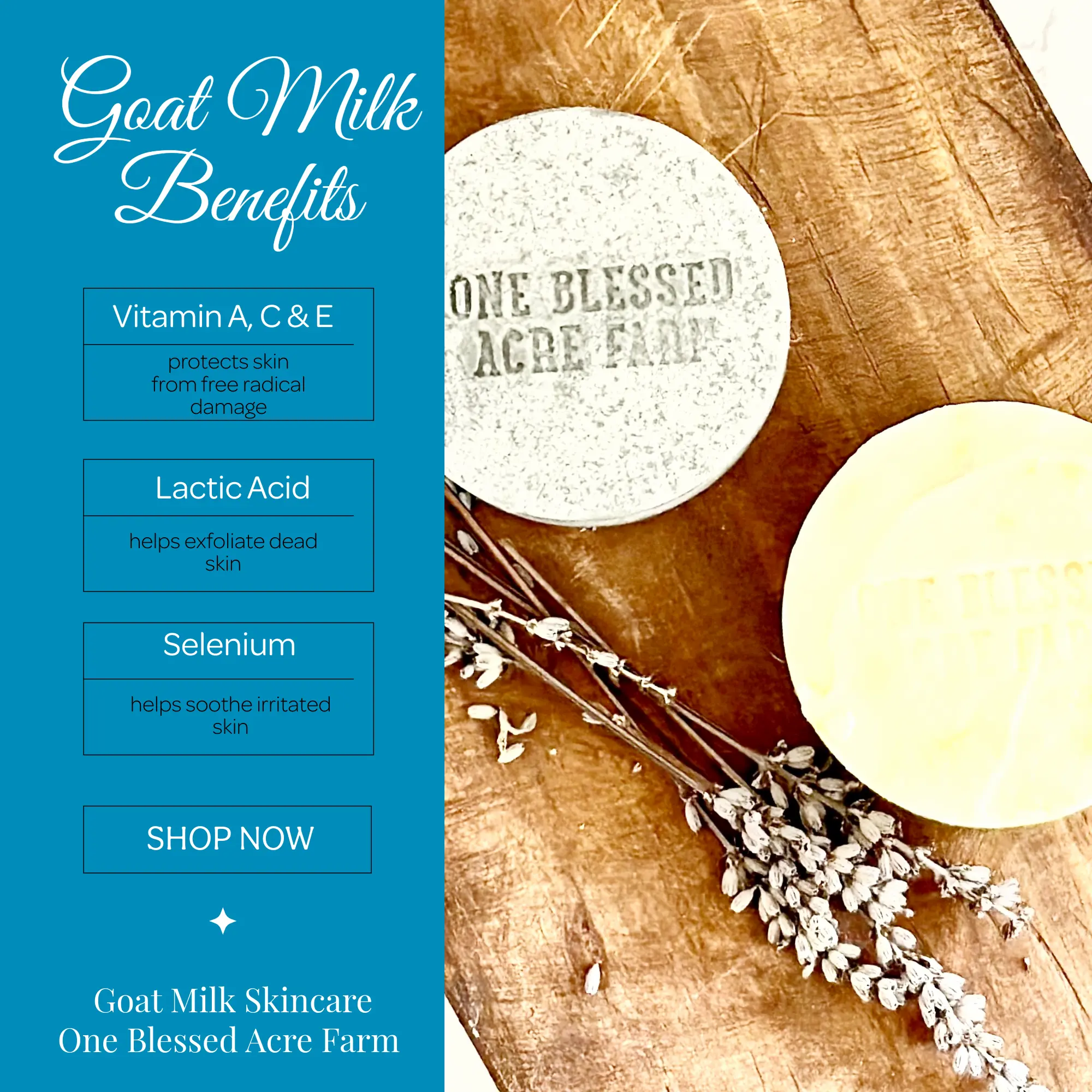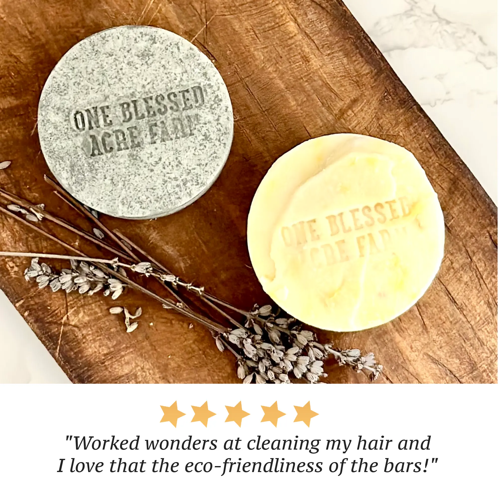 Our One Blessed Acre Farm Goat Milk Shampoo Bar is a natural, cold-process solid shampoo scented with refreshing Tea Tree and Lavender essential oils. This zero waste shampoo bar is perfect for those seeking eco friendly hair care, plastic free beauty, and clean ingredient scalp care.
