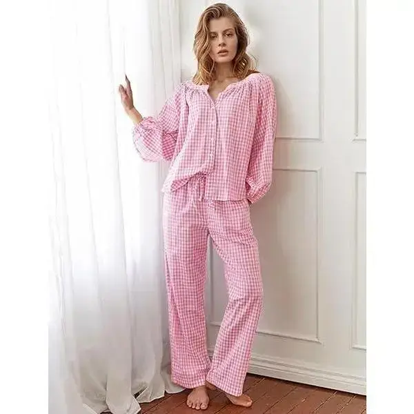 Womens Gingham Pajama Set 2 Piece Cotton Plaid Shirt and Pants 100% Premium Cotton �C Breathe Easy, Sleep Better Classic Buffalo Check More Than PJs, A Cozy Fall Top and Pants, You��ll Wear All Day. We Run True to Size! PS: These PJs are meant to be snug but not tight. When in doubt, size up for a looser feel! About this item: [100% Cotton Pjs]: Women��s pajama set is crafted from 100% premium pure cotton, offering softness with a touch of elasticity. It boasts excellent moisture absorption and breathability, ensuring gentle, irritation free comfort that��s kind to the skin, perfect for expectant mothers. Enjoy year round coziness and effortlessly create a sense of relaxation and style with this y2k set. [Pajama Plaid Top]: Classic women's pajama features a round neckline with button up design for easy on and off. The combination of puff sleeves and raglan sleeves not only provides freedom of movement but also enhances the design aesthetic, ensuring unrestricted comfort during sleep. The elastic cuffs on the long sleeves securely hold their position, keeping warmth in and preventing stains while eating or skincare, achieving an optimal balance of comfort, functionality, and aesthetic appeal. [Pajama Gingham Bottom]: These matching sleep pants feature a relaxed straight-leg cut that visually elongates the silhouette while eliminating constriction. The adjustable drawstring waist accommodates all body types, solving the common issues of tight elastic bands or slipping waistbands. Practical side pockets securely hold essentials like your phone, while the ankle-length design prevents tripping hazards and enhances an effortlessly relaxed chic vibe [Occasions]: Y2K pajamas perfect for everyday wear, sleeping, maternity nursing use, weddings, bridal or bridesmaid loungewear, travel, bedroom, slumber parties, spa days, Valentine's Day, girls day, and honeymoon getaways. They're equally perfect for leisurely balcony moments with coffee or tea. Pj set is an ideal gift for wife, girlfriend, or daughters during holidays and special occasions. [Warm Tips]: This package includes a color coordinated long sleeve pajama top with wide leg pants, offering effortless coordination that saves you time getting dressed. Crafted from 100% premium cotton, we recommend gentle machine washing in cold water or hand washing to maintain quality, followed by air drying to preserve the fabric's softness and shape.
