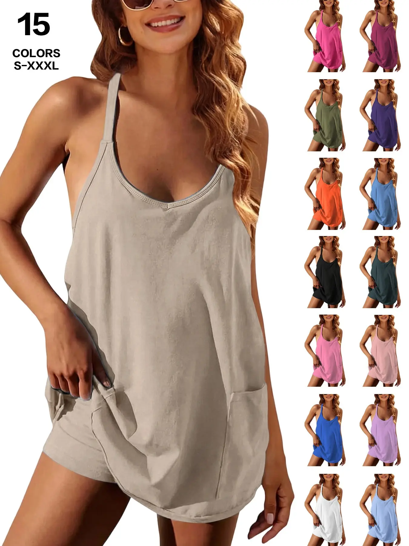 Womens Workout Romper Dress with Shorts Underneath Sleeveless Spaghetti Straps Athletic Outfits Casual Vacation