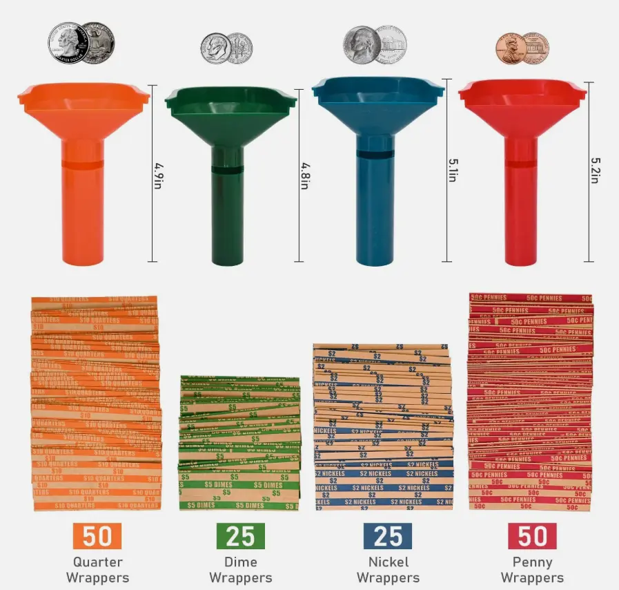 ·COIN SORTING TUBE & BAG SET: Including 150 assorted coin wrappers(Quartersx50, Penniesx50, Nickelsx25, Dimesx25, )and 4 coin sorting tubes