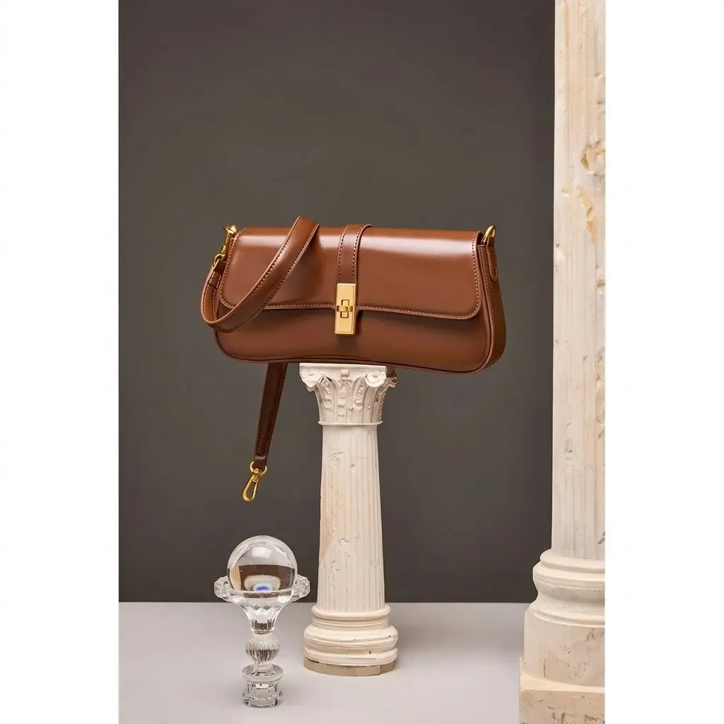 Minimalist Brown Leather Baguette Bag for Women Retro Underarm Shoulder Purse with Gold Lock
