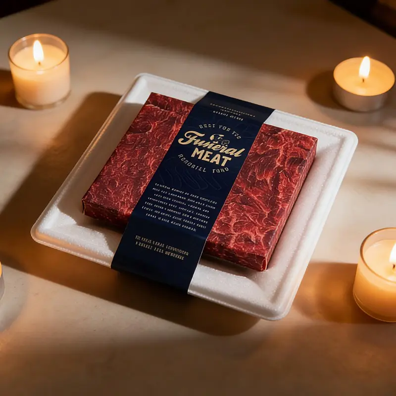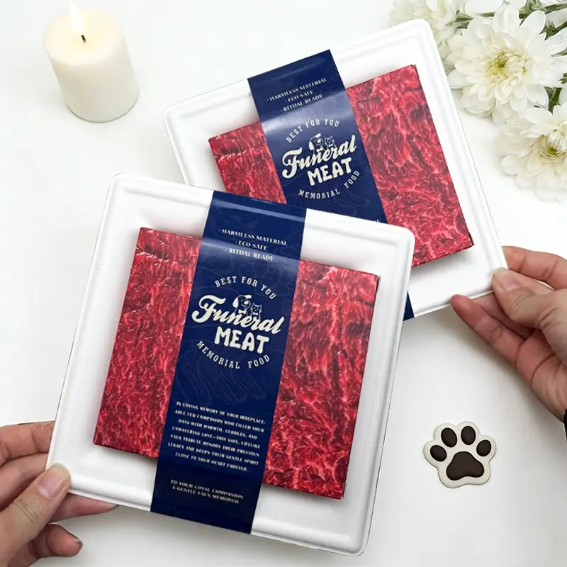 Realistic paper food offerings for pet memorial cremations, featuring beef and salmon; a combustible imitation sushi set suitable for pet funerals and as keepsakes for dogs, cats, small pets, rabbits, and hamsters