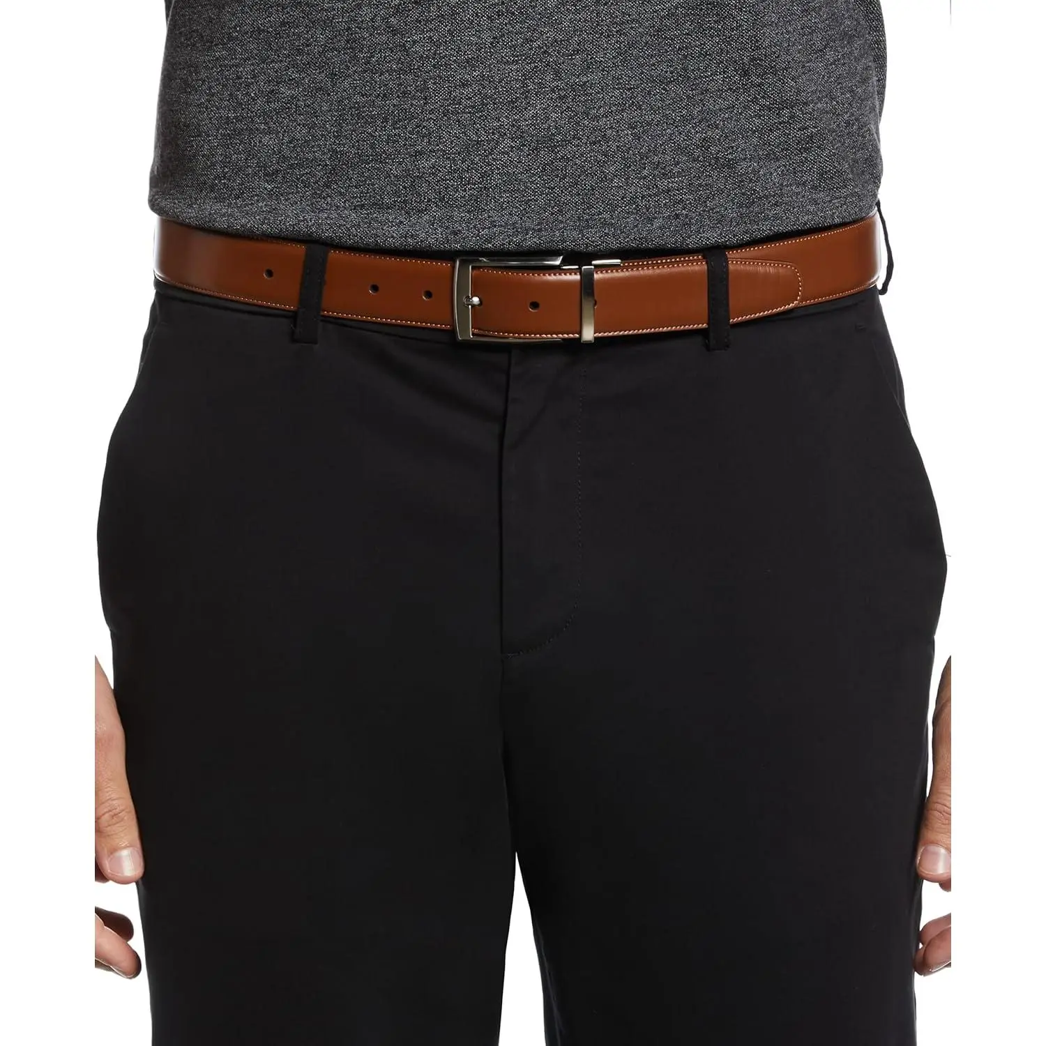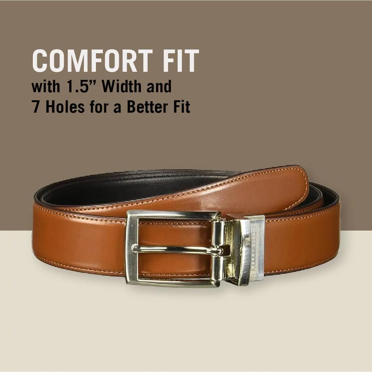 COMFORT FIT: Enjoy a comfortable fit with this leather belt for men, featuring stitche eges, a silver prong buckle, seven holes strategically place for a consistently better fit, an a 1.5" with that fits well with most ress pant loops.