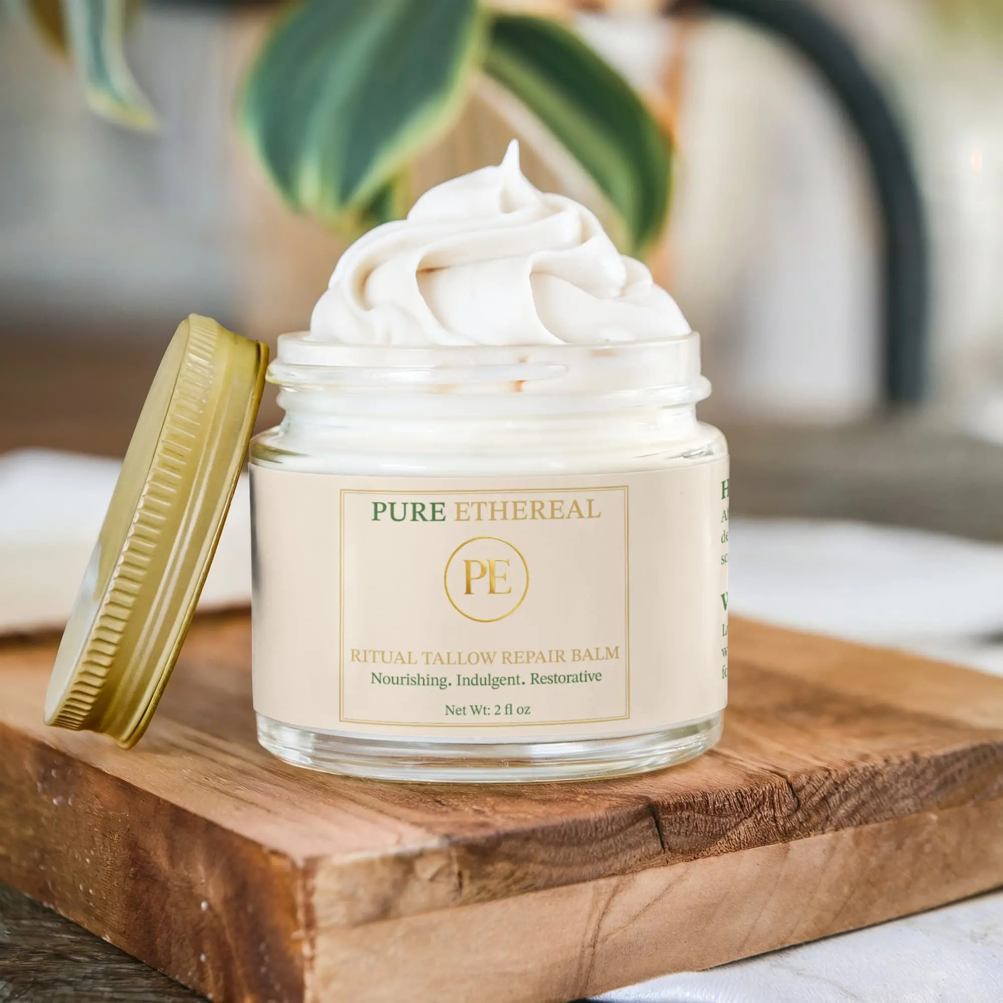 Grass-fed tallow for deep nourishment and vanilla essential oil for a subtle, natural warmth. Pure, simple, and skin-loving.