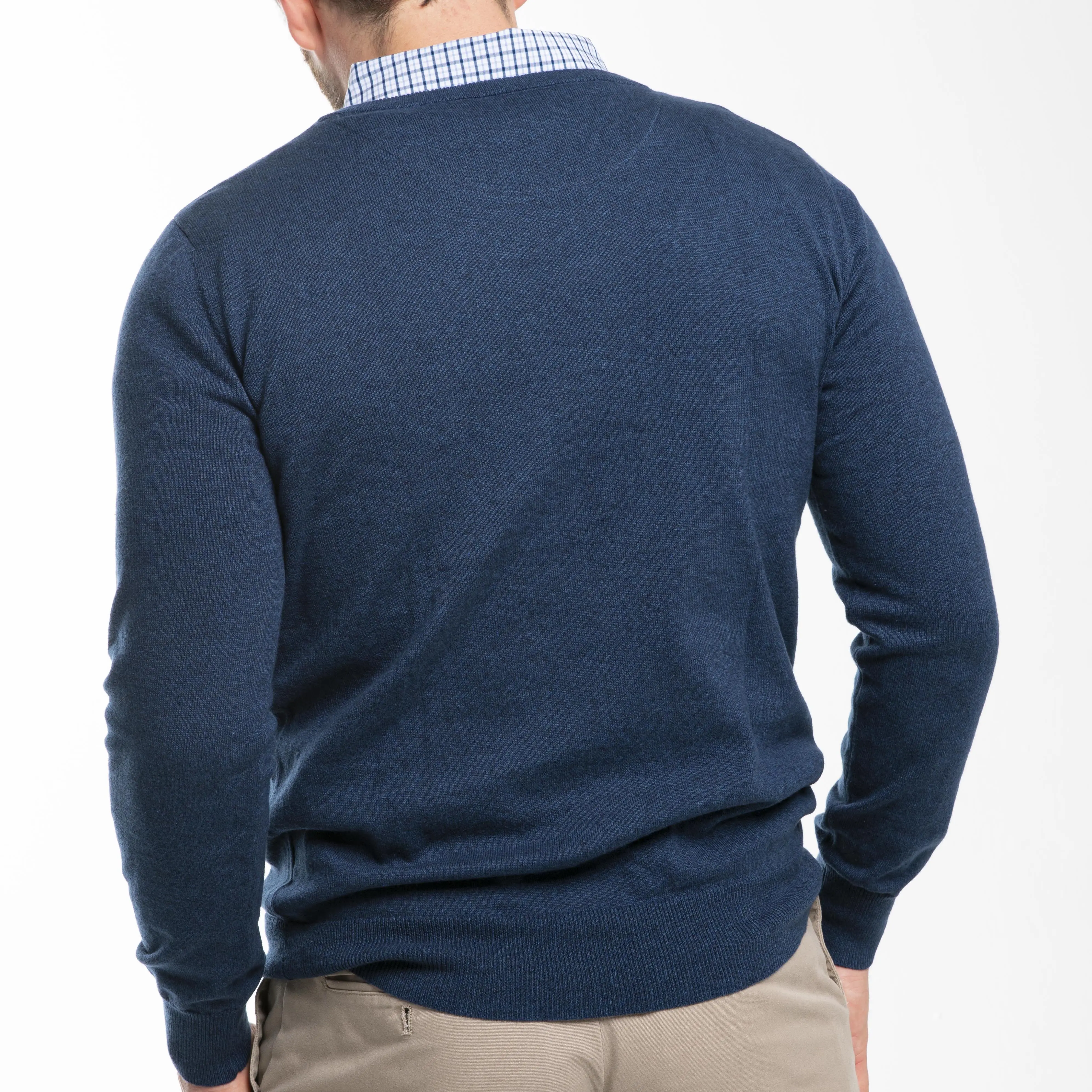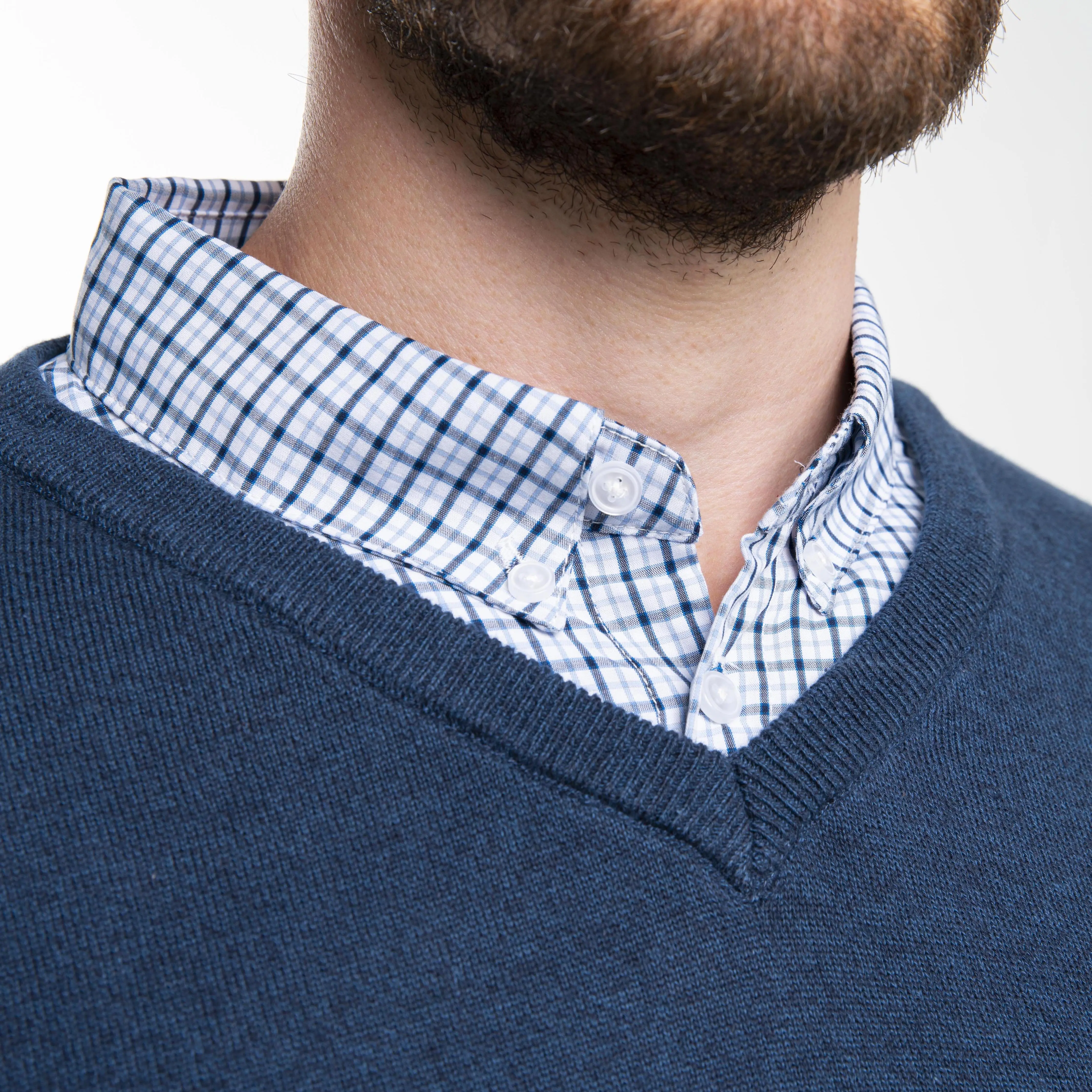 Our high quality, 100% cotton sweater in Ocean Blue has the bonus of an attached black & blue check collar to give the appearance of a shirt and sweater combo with no one being the wiser.