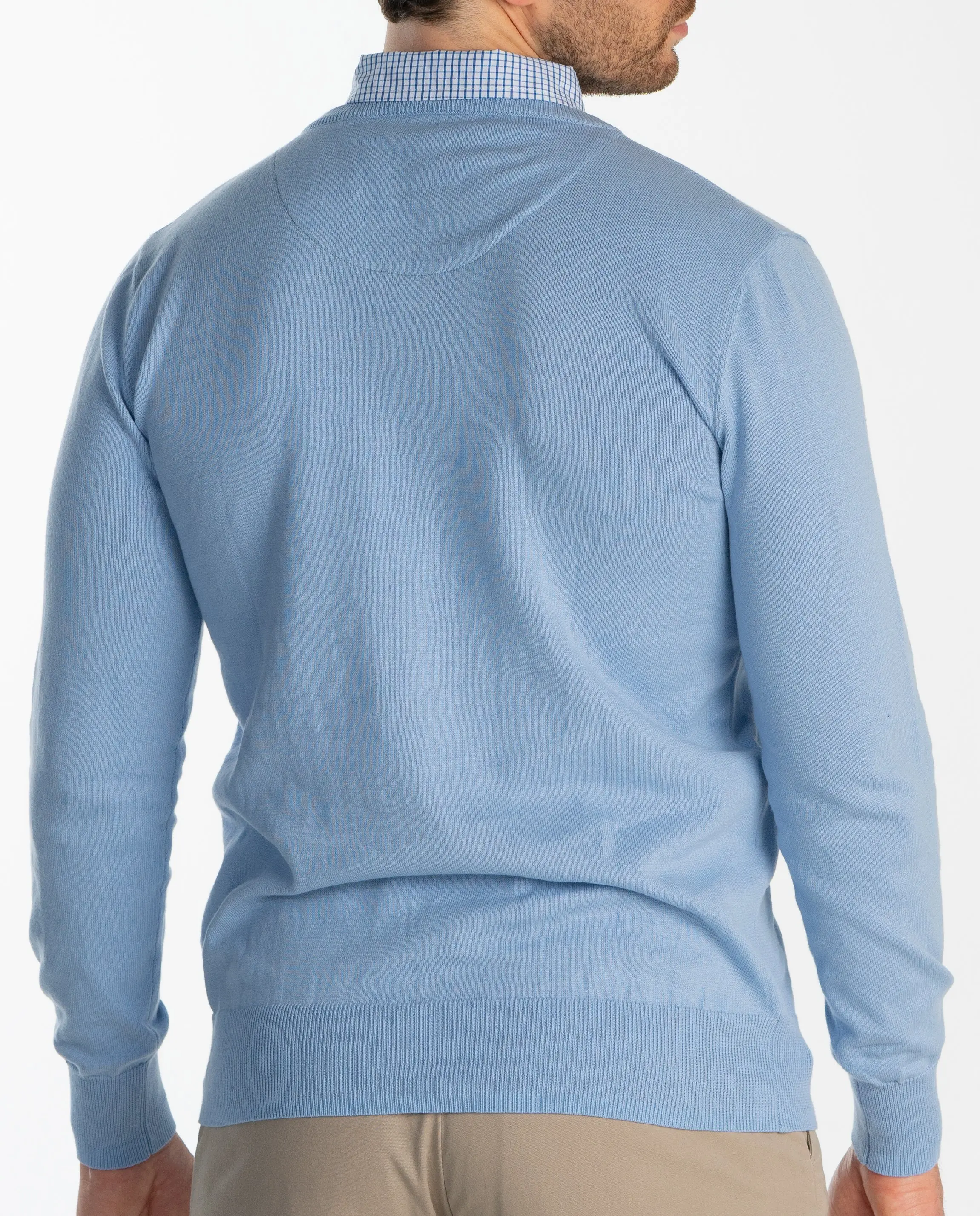 Our high quality, 100% cotton sweater in light blue has the bonus of an attached blue gingham collar to give the appearance of a shirt and sweater combo with no one being the wiser.