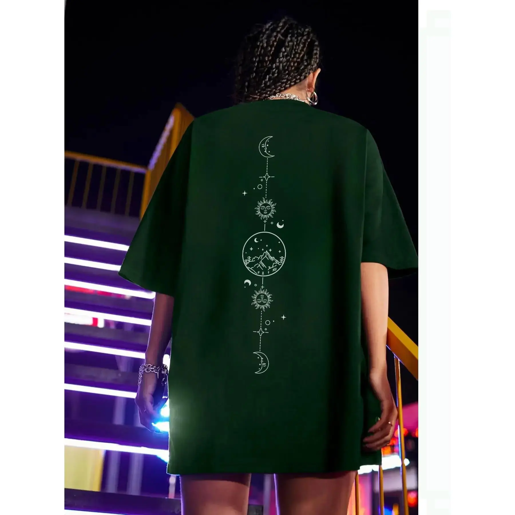 Featuring a striking moon and sun print, this tee captures a celestial-inspired aesthetic that feels both artistic and expressive. The design brings a sense of balance and individuality, making it perfect for those who love subtle statement pieces. Ideal for daily wear, casual outings, or streetwear styling, it pairs effortlessly with your go-to outfits while adding a unique, modern edge to your everyday look.