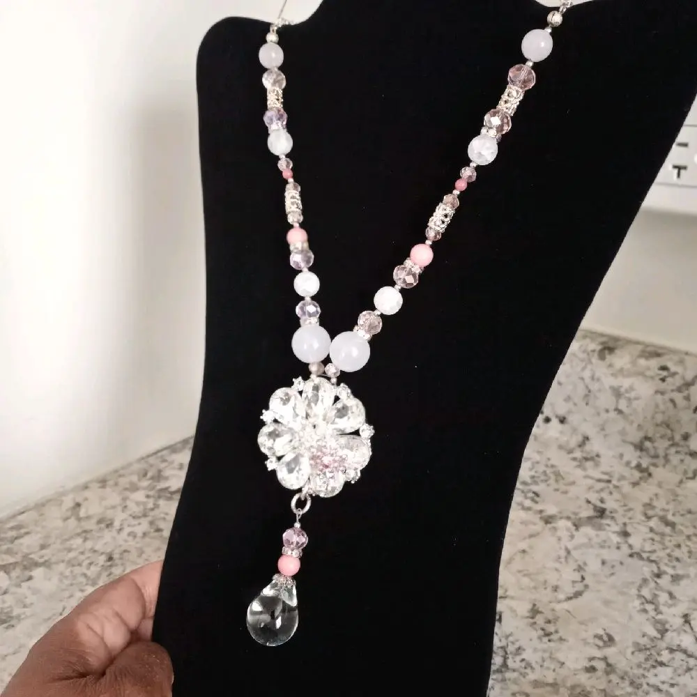 ✨ Elegant Design: This Rhinestone Flower Pendant features a stunning dew drop pendant from the Dew Drop Collection. Handcrafted by April Tee, it combines beauty with craftsmanship. Perfect for those who appreciate unique, handmade jewelry.