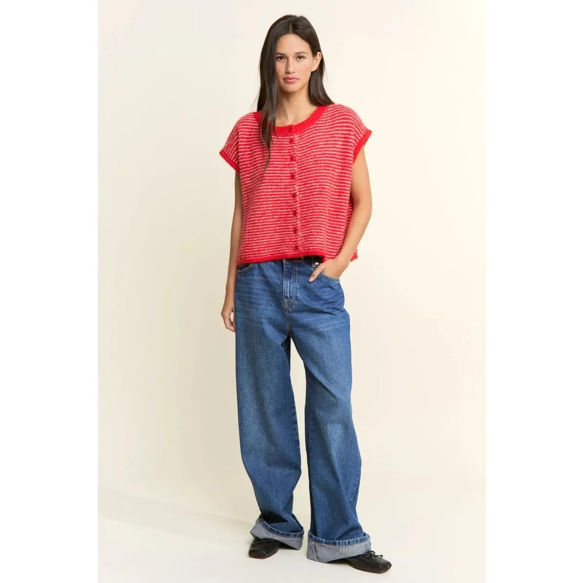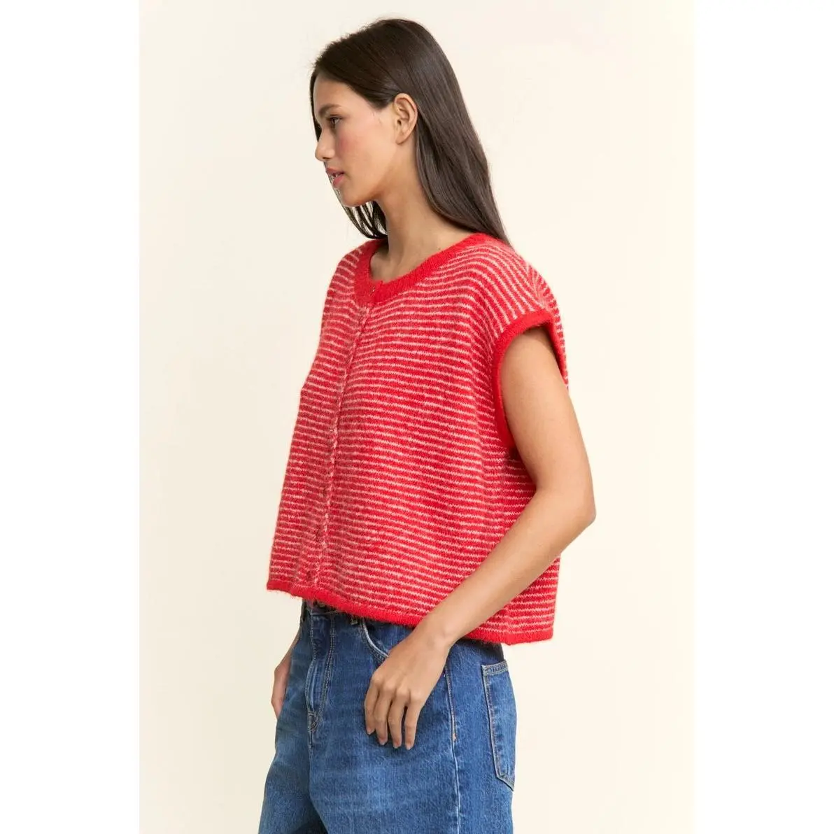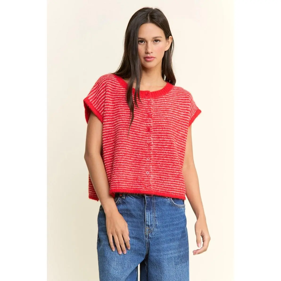 Effortless layering meets timeless style with the Pippa Short Sleeve Cardi. This red stripe button-up transitions seamlessly from winter into spring, offering the perfect lightweight layer for unpredictable weather. Slip it on over your favorite tee or dress it up with a simple tank—versatile enough for casual days and polished enough for weekend outings. The relaxed fit and soft fabric make it a go-to piece you'll reach for again and again.