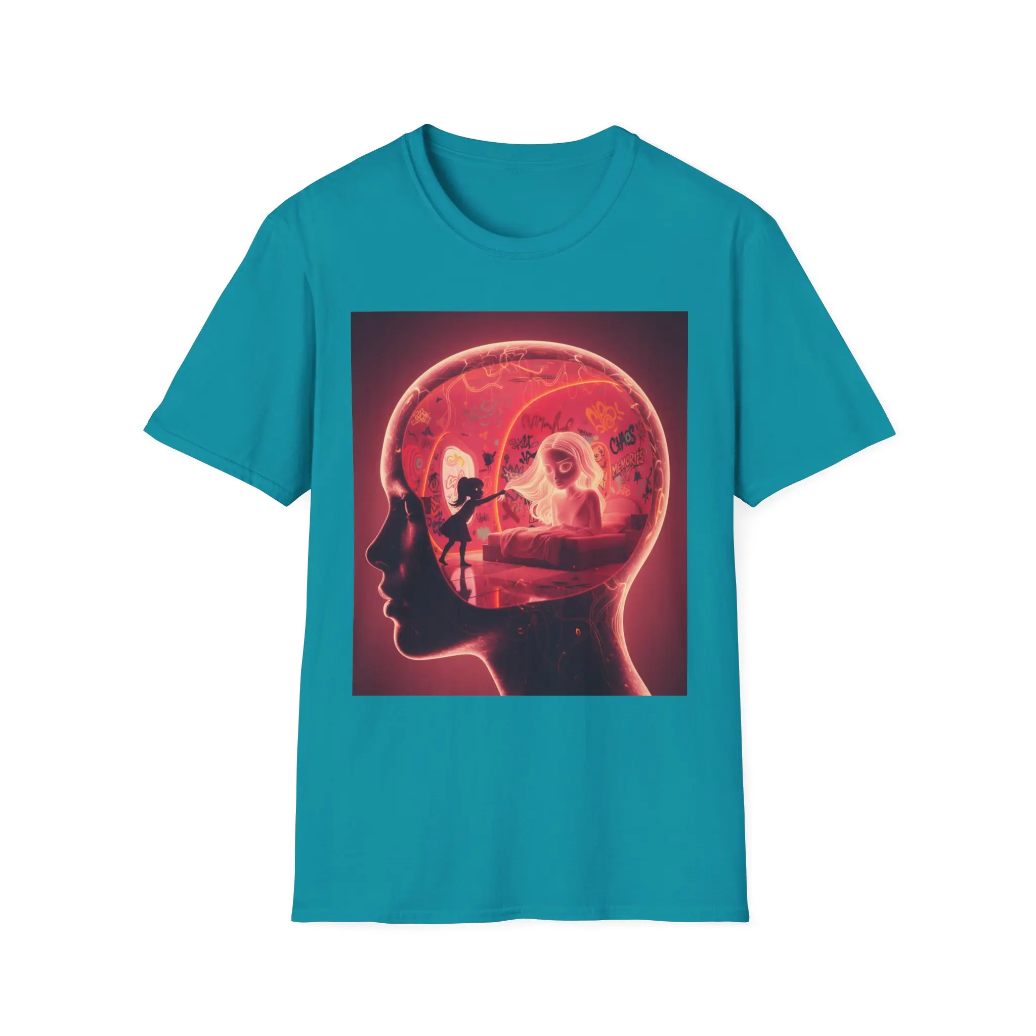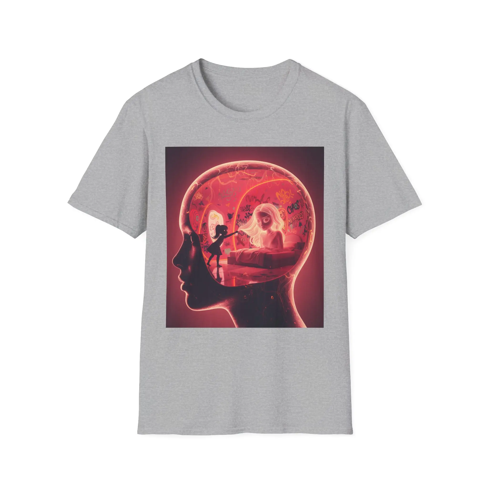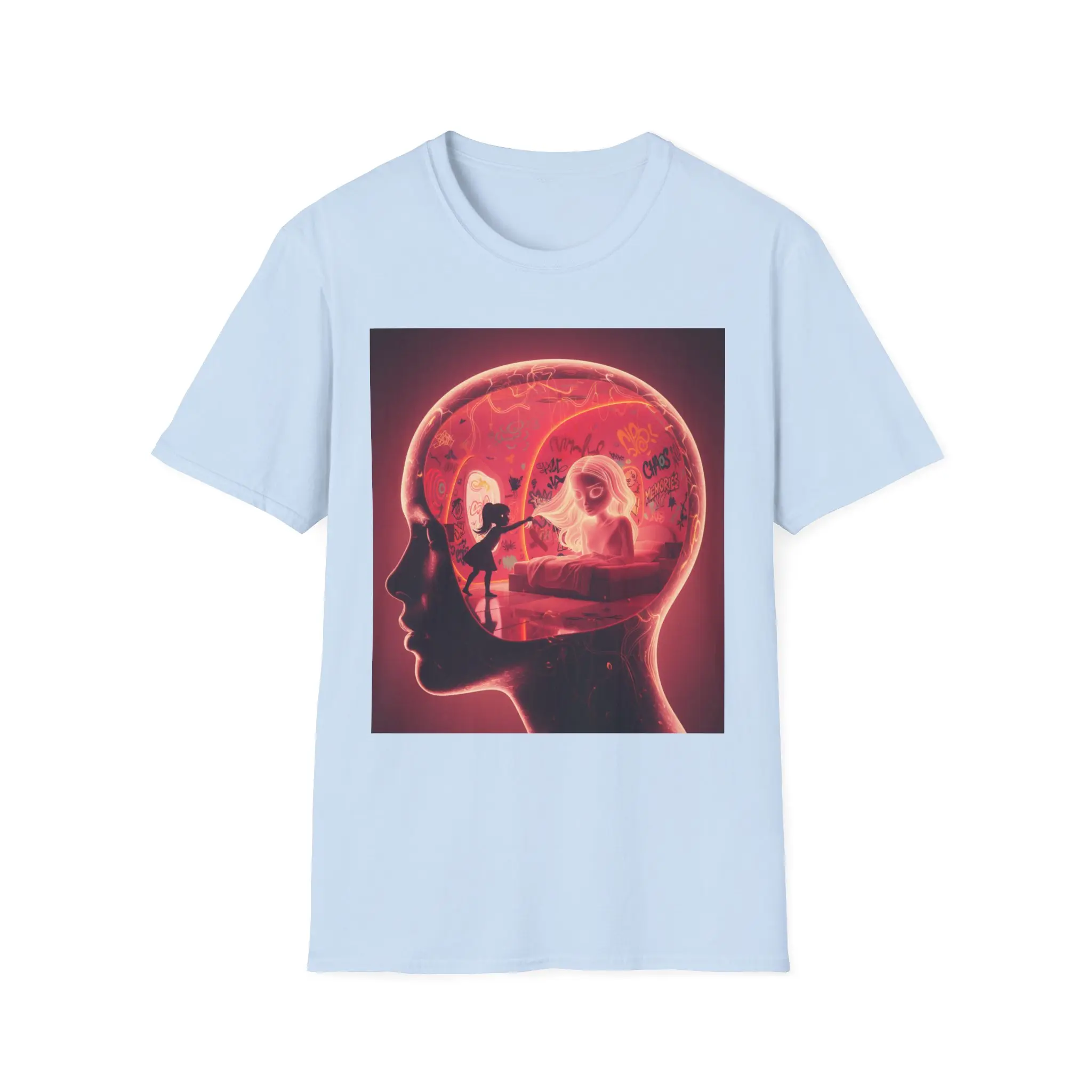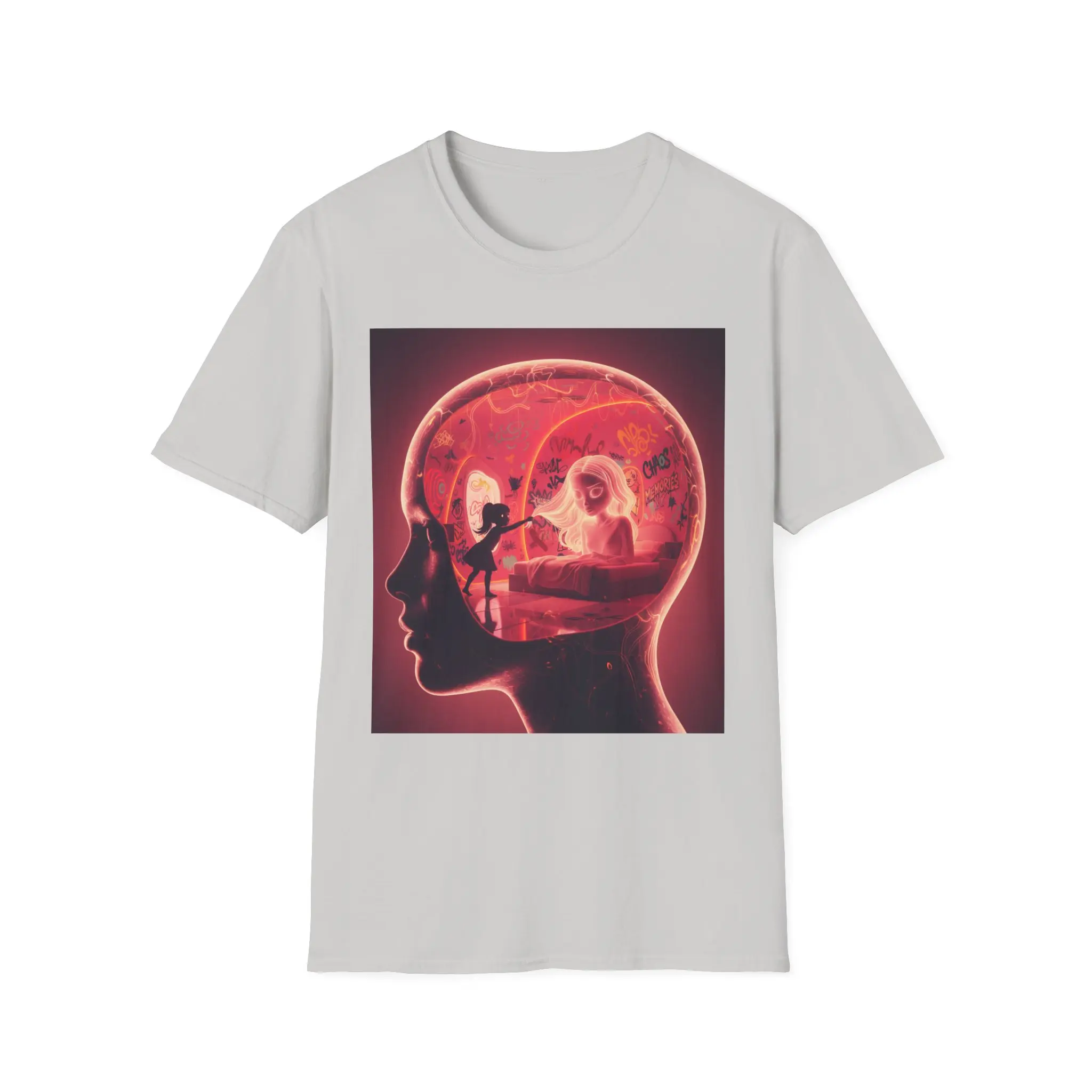 This lightweight cotton tee carries a bold, surreal print that feels like a quiet, late-night thought made visible. The design layers a human profile with an illuminated interior scene — a figure at a desk, warm red tones and soft shadows — creating a cinematic, introspective vibe. It sits on a clean white backdrop so the artwork stands out, while the classic crew silhouette keeps the look grounded and wearable. Wear it when you want your outfit to hint at storytelling: a little mysterious, emotionally charged, and quietly cinematic.